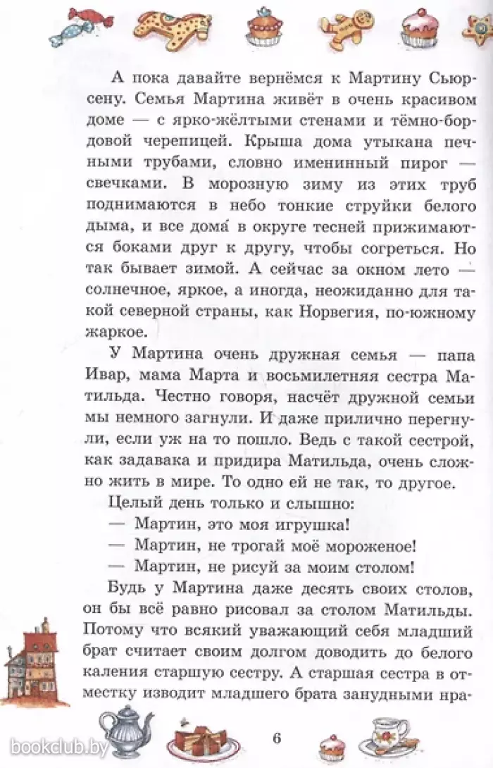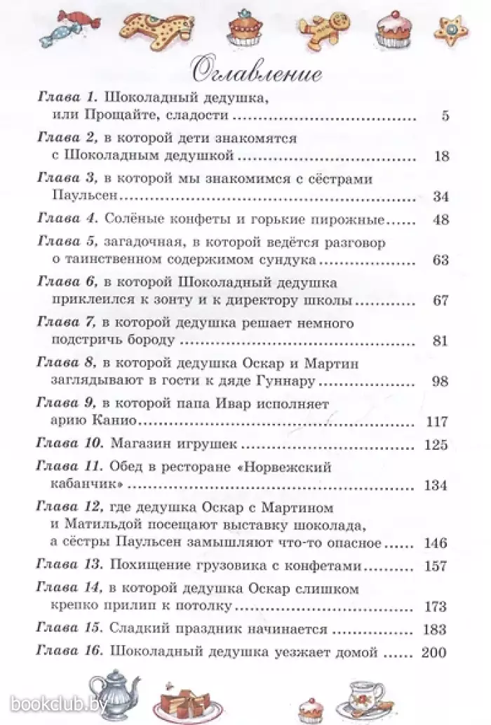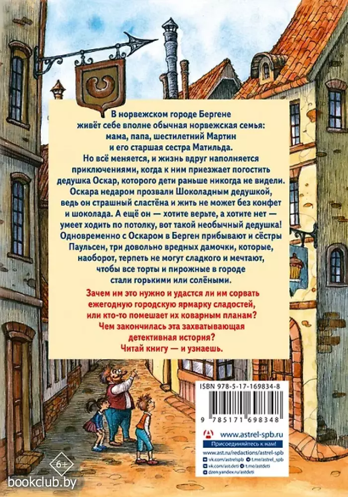В норвежском городе Бергене живёт себе вполне обычная норвежская семья: мама, папа, шестилетний Мартин и его старшая сестра Матильда. Но всё меняется, и жизнь вдруг наполняется приключениями, когда к ним приезжает погостить дедушка Оскар, которого дети раньше никогда не видели. Оскара недаром прозвали Шоколадным дедушкой, ведь он страшный сластёна и жить не может без конфет и шоколада. А ещё он — хотите верьте, а хотите нет — умеет ходить по потолку, вот такой необычный дедушка! Одновременно с Оскаром в Берген прибывают и сёстры Паульсен, три довольно вредных дамочки, которые, наоборот, терпеть не могут сладкого и мечтают, чтобы все торты и пирожные в городе стали горькими или солёными. Зачем им это нужно и удастся ли им сорвать ежегодную городскую ярмарку сладостей, или кто-то помешает их коварным планам? Чем закончилась эта захватывающая детективная история? Читайте книгу всей семьёй – и узнаете!