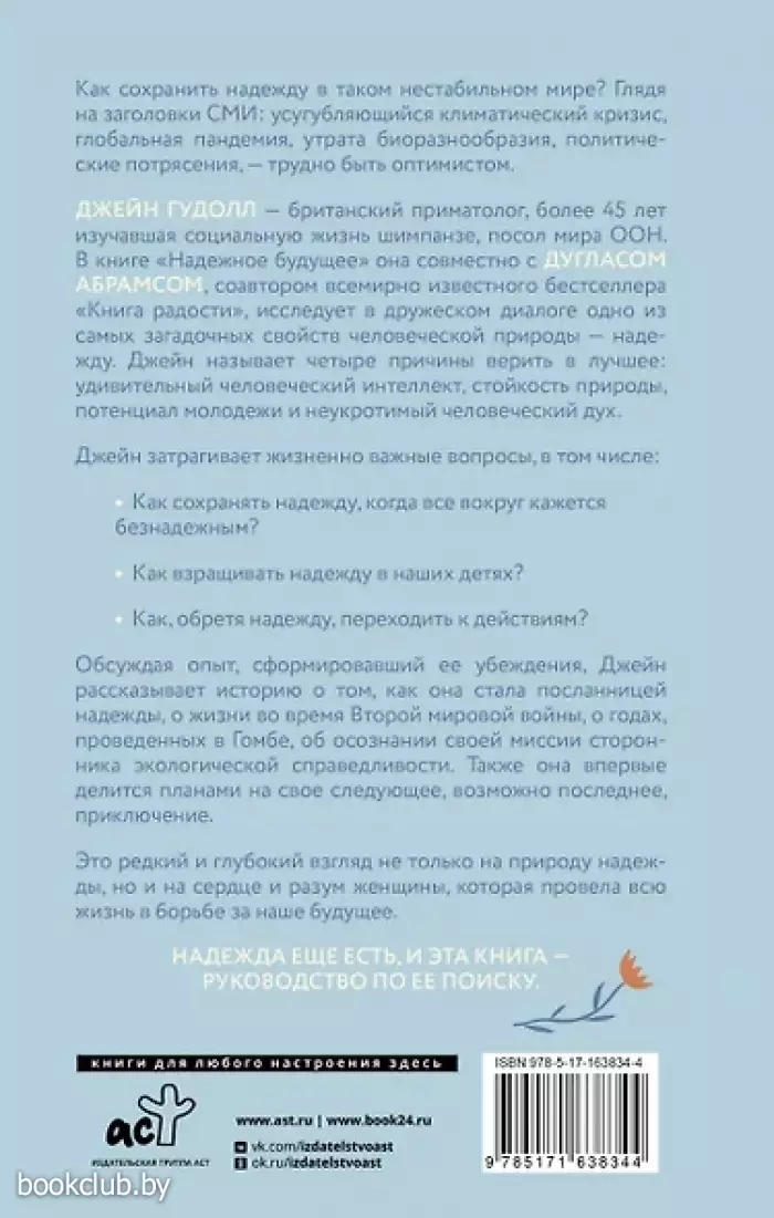 Джейн Гудолл – британский приматолог, более 45 лет изучавшая социальную жизнь шимпанзе, посол мира ООН. В книге "Надежное будущее" она совместно с Дугласом Абрамсом, соавтором всемирно известного бестселлера "Книга радости", исследует в дружеском диалоге одно из самых загадочных свойств человеческой природы – надежду. Джейн называет четыре причины верить в лучшее: удивительный человеческий интеллект, стойкость природы, потенциал молодежи и неукротимый человеческий дух.