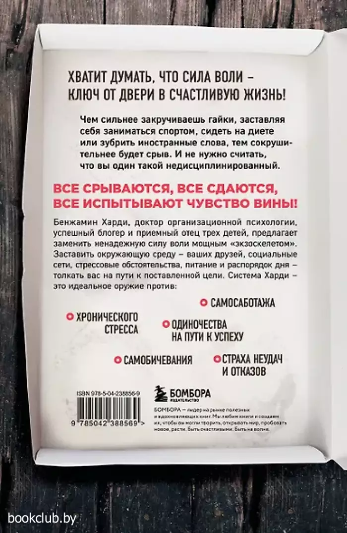 Хватит думать, что сила воли — ключ от двери в счастливую жизнь! Чем сильнее закручиваешь гайки, заставляя себя заниматься спортом, сидеть на диете или зубрить иностранные слова, тем сокрушительнее будет срыв. И не нужно считать, что вы один такой недисциплинированный. Все срываются, все сдаются, все испытывают чувство вины!Бенжамин Харди, доктор организационной психологии, успешный блогер и отец трех приемных детей, предлагает заменить ненадежную силу воли мощным "экзоскелетом". Заставить окружающую среду – ваших друзей, социальные сети, стрессовые обстоятельства, питание и распорядок дня – толкать вас на пути к поставленной цели. Система Харди – это идеальное оружие против:• самосаботажа,• самобичевания,• хронического стресса,• одиночества на пути к успеху,• страха неудач и отказов. Книга «Сила воли не работает. Пусть твое окружение работает вместо нее» - станет прекрасным дополнением вашей библиотеки. Для вашего удобства при оформлении заказа по телефону назовите код товара: 416971
