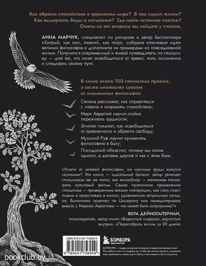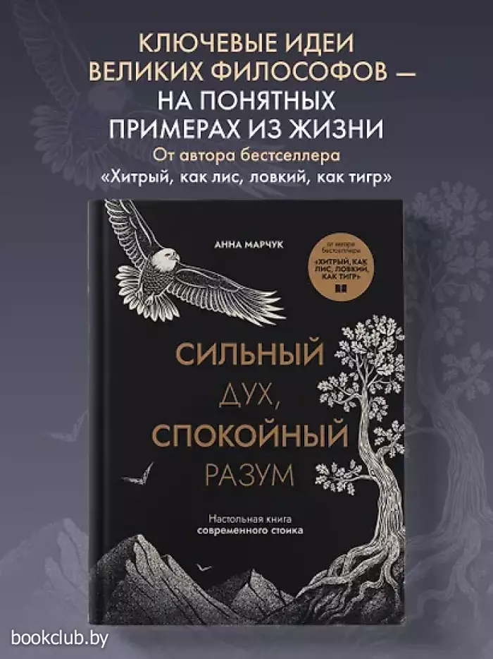 Как обрести спокойствие в тревожном мире? В чем смысл жизни? Как выдержать беды и испытания? Где найти истинное счастье? Ответы на эти вопросы вы найдете у стоиков. Анна Марчук, специалист по риторике и автор бестселлера «Хитрый, как лис, ловкий, как тигр» собрала ключевые идеи великих философов и дополнила их примерами из повседневной жизни. Получился современный и живой путеводитель по стоицизму — для тех, кто хочет освободиться от тревог, жить осознанно и следовать своему пути. В книге около 100 стоических практик, а также множество советов от знаменитых философов: • Сенека расскажет, как справляться с гневом и сохранять спокойствие. • Марк Аврелий научит руководить и стойко переживать трудности. • Эпиктет покажет, как освободиться от тревожности и обрести свободу. • Музоний Руф научит применять философию в быту. • Посидоний объяснит, почему мы хотим одно, а делаем другое, и как с этим быть. «Если вы переросли сетевую философию и психологию, но читать научные труды в библиотеке вас пока еще не тянет, эта книга для вас. Говоря простым языком, автор заражает читателя философией стоицизма так же легко, как кинообзор увлекает нас посмотреть культовый фильм. А главное, в этой книге у стоицизма самое практическое применение. Здесь вы найдете проверенные временем и действительно работающие инструкции для того, как стать счастливым и преуспевать в жизни. И удивитесь, насколько античные решения актуальны именно сегодня для каждого из нас. Выполнить практику по заветам Цицерона или помедитировать вместе с Марком Аврелием — что может быть остроумнее?» — Вера Дейногалериан, психотерапевт, автор книги «Взрослый снаружи, взрослый внутри», «Пересобрать жизнь за 30 дней» Книга «Сильный дух, спокойный разум. Настольная книга современного стоика» не только принесёт множество приятных эмоций, но и может послужить замечательным подарком для ваших близких. Для вашего удобства при оформлении заказа по телефону назовите код товара: 416993