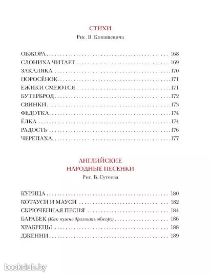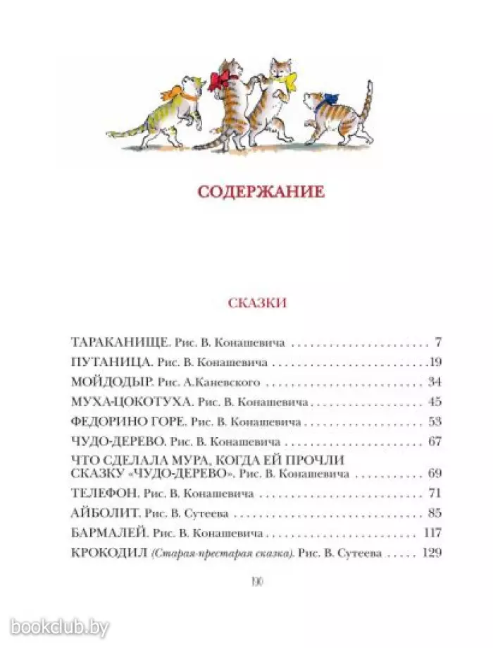 доктора Айболита, про Муху-Цокотуху и её храброго спасителя Комарика, про страшного Крокодила, проглотившего солнце в небе, про Федорино горе, весёлые, добрые стихи про бедного Федотку, про страшную Закаляку, английские песенки про курицу-красавицу, про хитрого Котауси и умную Мауси,про обжору Барабека…