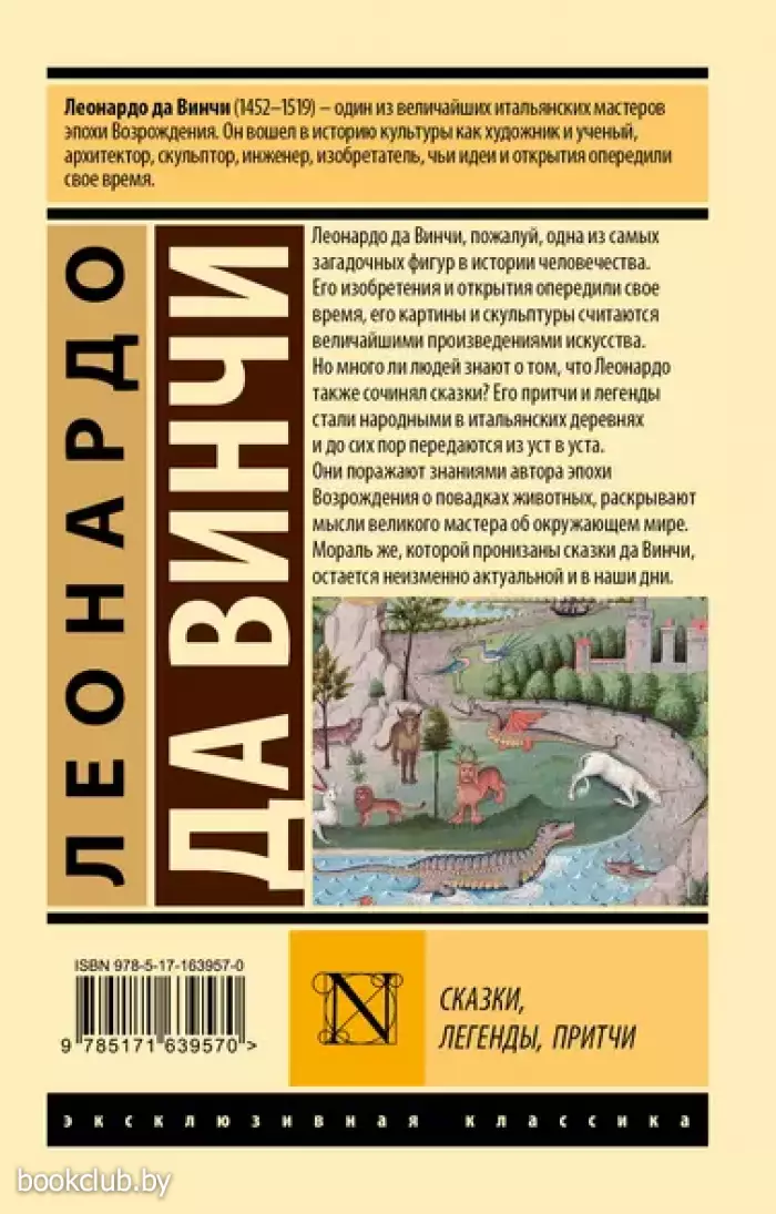 Леонардо да Винчи, пожалуй, одна из самых загадочных фигур в истории человечества. Его изобретения и открытия опередили свое время, его картины и скульптуры считаются величайшими произведениями искусства. Но много ли людей знает о том, что Леонардо также сочинял сказки? Его притчи и легенды стали народными в итальянский деревнях и до сих передаются из уст в уста. Они поражают знаниями автора эпохи Возрождения о повадках животных, раскрывают мысли великого мастера об окружающем мире. Мораль же, которой пронизаны сказки да Винчи, остается неизменно актуальной и в наши дни.