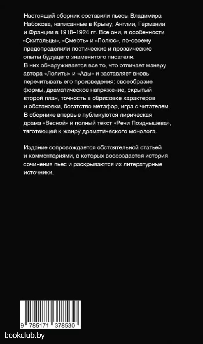 В сборнике представлены пьесы Владимира Набокова, написанные в Крыму, Англии, Германии и Франции в 1918–1924 гг. Все они, в особенности "Скитальцы", "Смерть" и "Полюс", по‑своему предопределили поэтические и прозаические опыты будущего знаменитого писателя. В этих ранних пьесах обнаруживается все то, что отличает манеру автора "Лолиты" и "Ады" и заставляет с еще большим интересом перечитывать его произведения: своеобразие формы, драматическое напряжение, скрытый второй план, точность в обрисовке характеров и обстановки, богатство метафор.