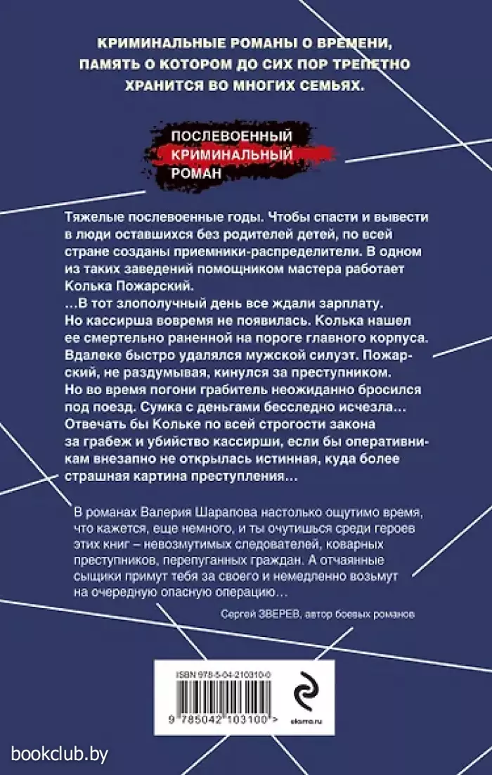 «В романах Валерия Шарапова настолько ощутимо время, что кажется, еще немного, и ты очутишься среди героев этих книг — невозмутимых следователей, коварных преступников, перепуганных граждан. А отчаянные сыщики примут тебя за своего и немедленно возьмут на очередную опасную операцию…» — Сергей ЗВЕРЕВ, автор боевых романов