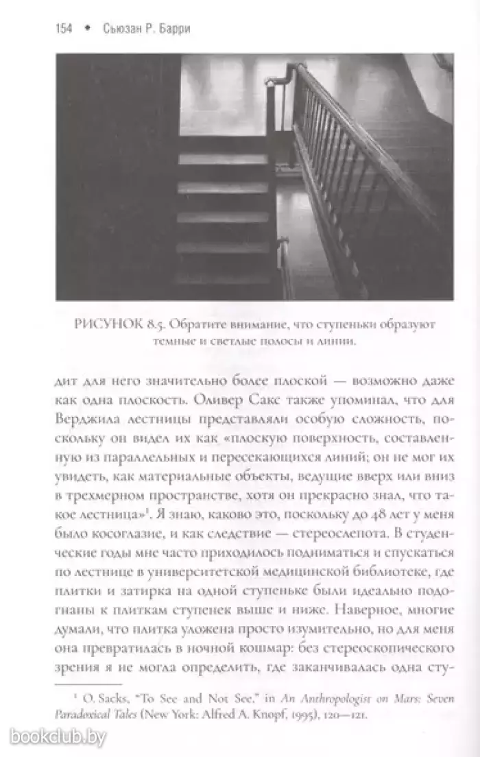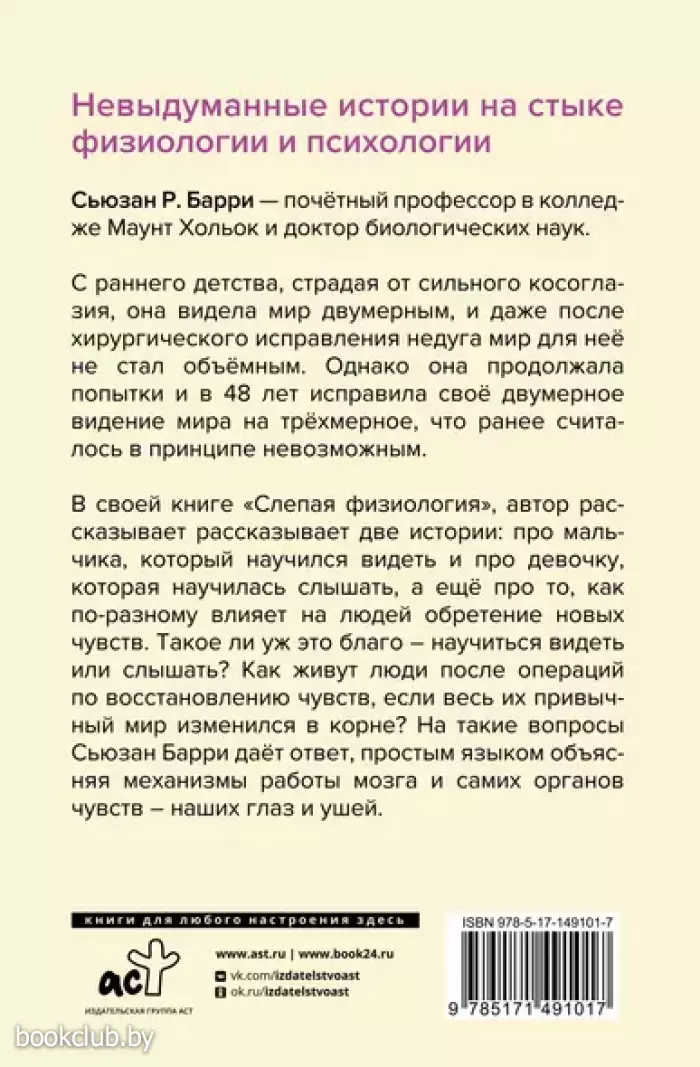 Сьюзан Р. Барри — почётный профессор в колледже Маунт Хольок и доктор биологических наук.С раннего детства, страдая от сильного косоглазия, она видела мир двумерным, и даже послехирургического исправления недуга мир для неё не стал объёмным. Однако она продолжалапопытки и в 48 лет исправила своё двумерное видение мира на трёхмерное, что ранее считалось в принципе невозможным.В своей книге "Слепая физиология", автор рассказывает две истории: про мальчика, который научился видеть и про девочку, которая научилась слышать, а ещё про то, как по-разному влияет на людей обретение новых чувств. Такое ли уж это благо – научиться видеть или слышать? Как живут люди после операций по восстановлению чувств, если весь их привычный мир изменился в корне? На такие вопросы Сьюзан Барри даёт ответ, простым языком объясняя механизмы работы мозга и самих органов чувств – наших глаз и ушей.