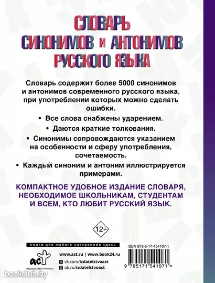 Предлагаемый словарь содержит более 5000 слов и состоит из двух частей: словаря синонимов и словаря антонимов. В словарь включены наиболее употребительные слова русского литературного языка, живой разговорной речи, некоторые специальные термины, имеющие широкое распространение, а также ряд устаревших слов, встречающихся в произведениях художественной литературы, изучаемых в школе. Все слова, кроме односложных, снабжены ударением. К каждому слову даётся краткое толкование, синонимы сопровождаются стилистическими пометами. Словарные статьи проиллюстрированы примерами. Книга призвана помочь тем, кто стремится лучше овладеть родным языком, сделать свою речь выразительнее и обогатить словарный запас.Издание предназначено для учащихся школ, студентов, преподавателей и станет хорошим помощником при подготовке к урокам и экзаменам.