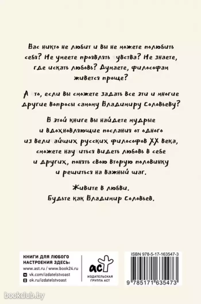 Мы каждый день задаем себе сложные жизненные вопросы и не знаем, где найти на них ответы. А что, если бы вы могли задать их великому русскому философу Владимиру Соловьеву? В этой книге вы найдете мудрые и вдохновляющие послания от одного из величайших философов XX века, сможете научиться видеть любовь в себе и других, понять свою вторую половинку и решиться на важный шаг.
