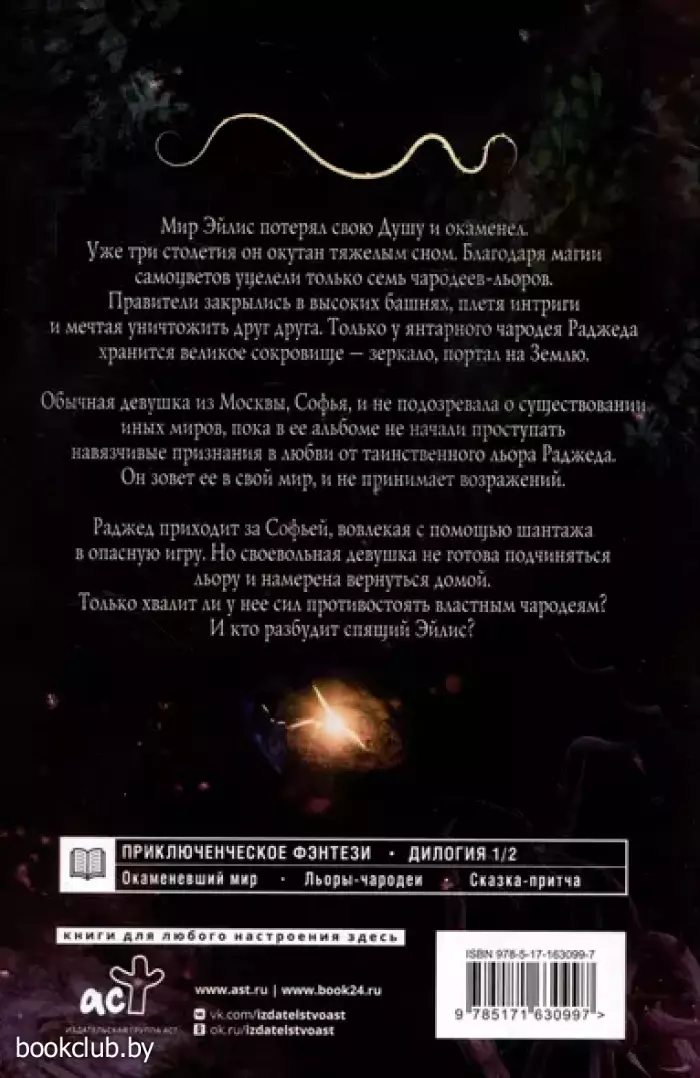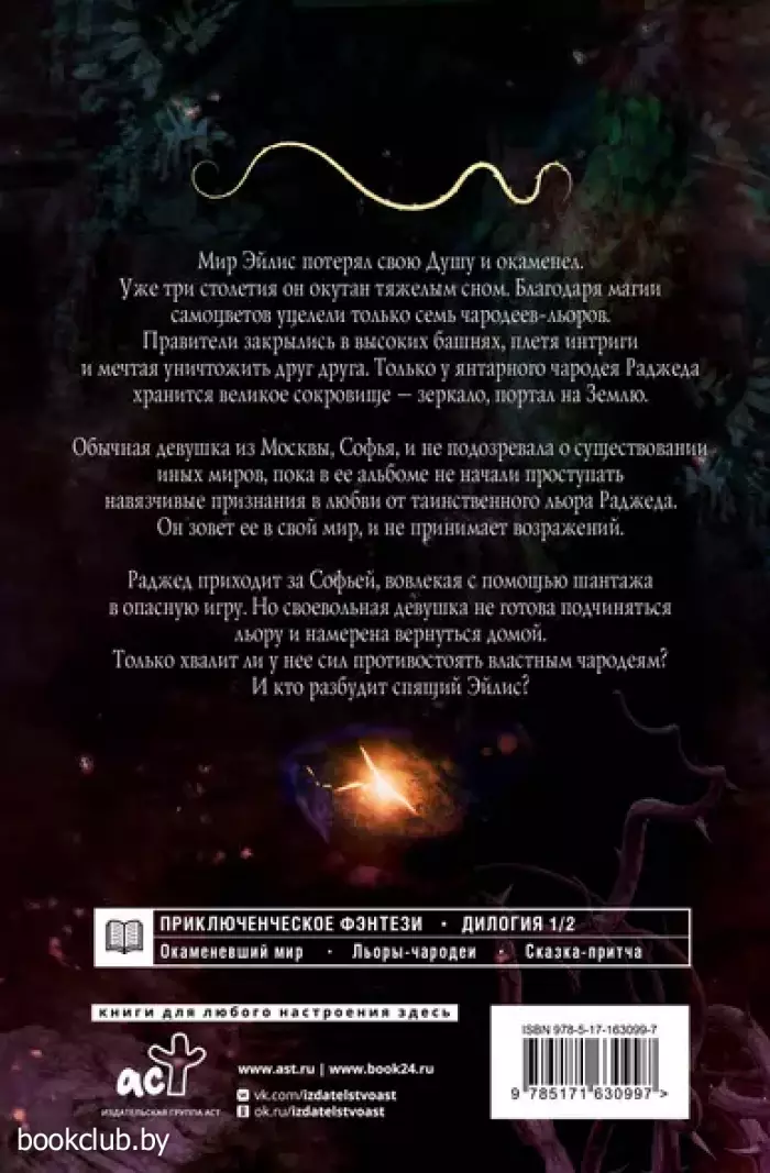 Мир Эйлис потерял свою Душу и окаменел. Уже три столетия он окутан тяжелым сном. Благодаря магии самоцветов уцелели только семь чародеев-льоров. Правители закрылись в высоких башнях, плетя интриги и мечтая уничтожить друг друга. Только у янтарного чародея Раджеда хранится великое сокровище — зеркало, портал на Землю. Обычная девушка из Москвы Софья не подозревала о существовании иных миров, пока в ее альбоме не начали проступать навязчивые признания в любви от таинственного льора Раджеда. Он зовет ее в свой мир и не принимает возражений. Раджед приходит за Софьей, вовлекая с помощью шантажа в опасную игру. Но своевольная девушка не готова подчиняться льору и намерена вернуться домой. Только хватит ли у нее сил противостоять властным чародеям? И кто разбудит спящий Эйлис?