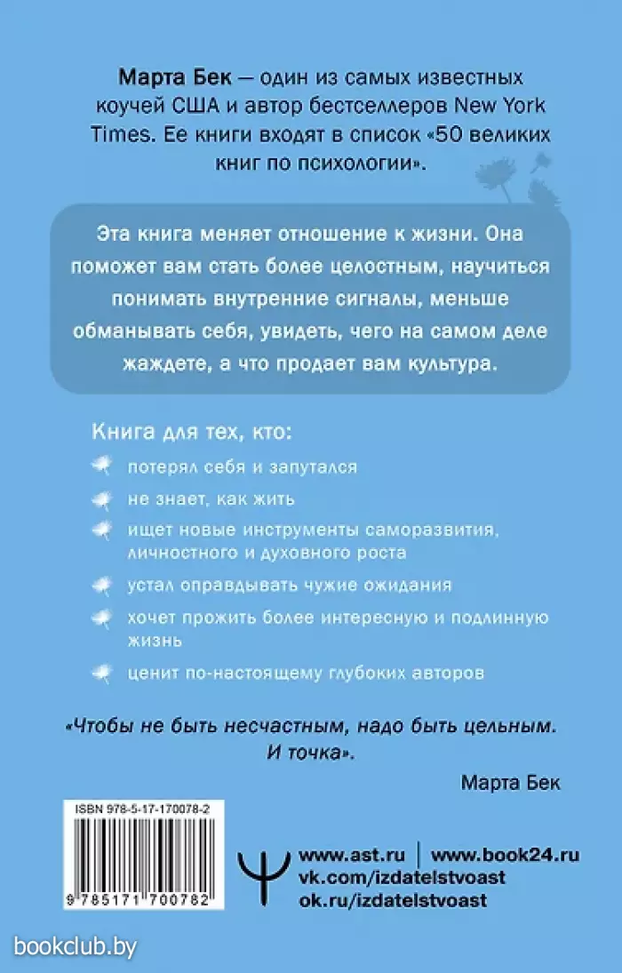 Почему вы страдаете, зачем общаетесь с неприятными людьми, сохраняете травмирующие отношения, а в минуты отчаянья хватаетесь за негативные привычки? Все просто — вы потеряли себя. Это не вы, а некий образцовый гражданин, которого хотят видеть родители, супруги, работодатели, друзья. Марта Бек — один из самых известных коучей США и автор бестселлеров New York Times, ее книги входят в список «50 великих книг по психологии» — поможет вам стать более целостным, начать жить своей жизнью и перестать предавать себя. Упражнения, которые она предлагает, просты только на первый взгляд. Чтобы выполнить их, вам придется отправиться в настоящее духовное приключение. Будет нелегко, иногда страшно, а иногда больно. Но в итоге вы научитесь понимать внутренние сигналы, будете меньше обманывать, в том числе и себя, увидите, чего на самом деле жаждете, а что культура продает вам.