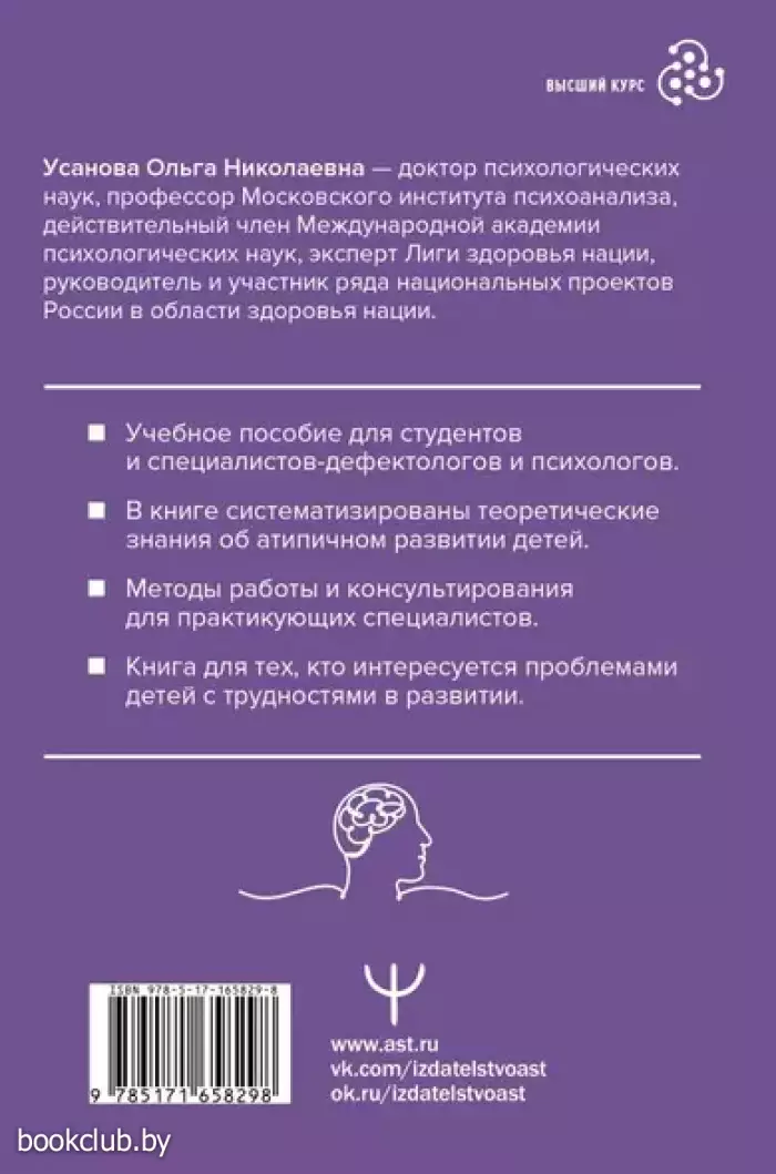 Усанова Ольга Николаевна — доктор психологических наук, профессор Московского института психоанализа, действительный член Международной академии психологических наук, эксперт Лиги здоровья нации, руководитель и участник ряда национальных проектов России в области здоровья нации. Специальная психология — наука, помогающая понять особенности атипичного развития психики детей и объясняющая, как выявлять трудности в развитии, определять виды работ, которые помогут ребенку преодолевать сложные жизненные ситуации и повысить качество жизни. В книге излагается история возникновения специальной психологии как отрасли психологической науки и практики, ее методология, принципы и концептуальные источники. В ней систематизированы основные термины и понятия относительно молодой отрасли психологии, рассматриваются основные проблемы науки и излагаются способы помощи детям с трудностями в развитии с акцентами на улучшение психологической экологии жизни и повышения ее качества. Читатели познакомятся с характеристиками атипичного развития, технологией психодиагностики, методами психологического консультирования таких детей и методами терапии и коррекции. Все это формирует необходимую базу знаний, современное мировоззрение и профессиональное мышление специалиста. Учебное пособие будет полезно студентам-дефектологам и психологам, педагогам, воспитателям, — всем, кто интересуется проблемами детей с трудностями в развитии.