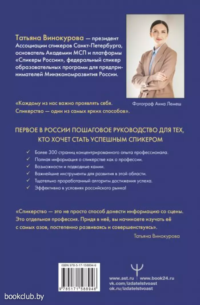 Можно ли научиться выступать публично и стать великолепным спикером? Ораторское мастерство — такой же навык, как управление автомобилем. Автор этой книги, президент ассоциации спикеров Санкт-Петербурга Татьяна Винокурова делится с читателями уникальной дорожной картой, с помощью которой они смогут построить свой бренд, освоить секреты ярких выступлений, понять, чем удержать слушателей. В книге даётся набор прикладных инструментов, которые эффективно работают в условиях российского рынка. Собрана полная информация о спикерстве, представлены упражнения для развития ораторского дара, выстроен тщательно проработанный алгоритм восхождения на спикерский олимп. Спикерство — это самый актуальный тренд и, освоив профессию спикера, можно добиться успеха в очень разных областях.