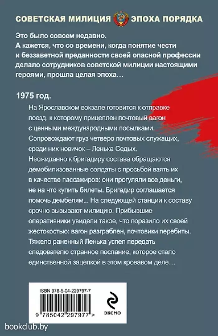 Романы о настоящих героях своей эпохи — сотрудниках советской милиции, людях, для которых служебный подвиг — обыденное дело. 1975 год. На Ярославском вокзале готовится к отправке поезд, к которому прицеплен почтовый вагон с ценными международными посылками. Сопровождают груз четверо почтовых служащих, среди них новичок — Ленька Седых. Неожиданно к бригадиру состава обращаются демобилизованные солдаты с просьбой взять их в качестве пассажиров: они прогуляли все деньги, не на что купить билеты. Бригадир соглашается помочь дембелям... На следующей станции к составу срочно вызывают милицию. Прибывшие оперативники увидели такое, что поразило их своей жестокостью: вагон разграблен, почтовики перебиты. Тяжело раненный Ленька успел передать следователю странное послание, которое стало единственной зацепкой в этом кровавом деле… Это было совсем недавно. Когда честь и беззаветная преданность опасной профессии были главными и обязательными качествами советских милиционеров… Книга от издательства «ЭКСМО», входящая в серию «Советская милиция. Эпоха порядка (обложка)», принесет массу положительных впечатлений от прочтения и займет достойное место в вашей библиотеке. Для вашего удобства при оформлении заказа по телефону назовите код товара: 417073