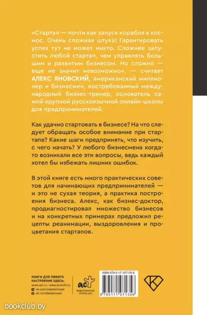 "«Стартап — почти как запуск корабля в космос. Очень сложная штука! Гарантировать успех тут не может никто. Сложнее запустить любой стартап, чем управлять большим и развитым бизнесом. Но сложно — еще не значит невозможно», — считает Алекс Яновский, американский миллионер и бизнесмен, востребованный международный бизнес-тренер, основатель самой крупной русскоязычной онлайн-школы для предпринимателей.