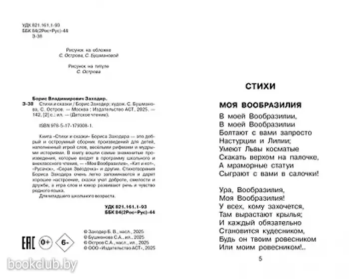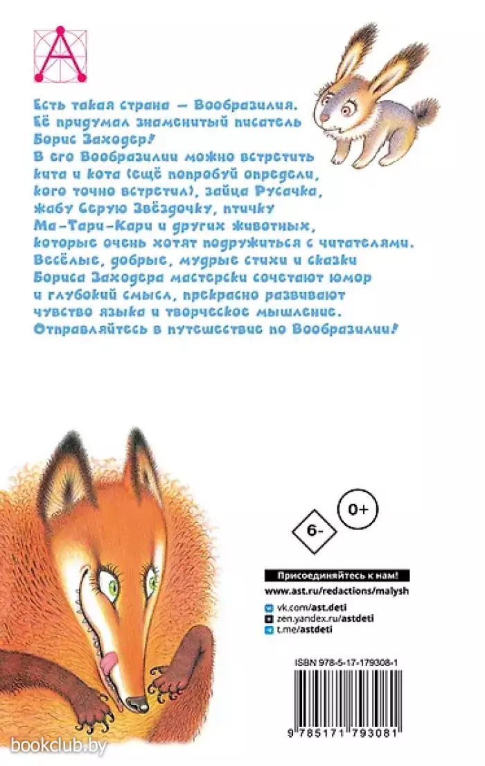 Книга «Стихи и сказки» Бориса Заходера — это добрый и остроумный сборник произведений для детей, наполненный игрой слов, весёлыми рифмами и мудрыми историями. В книгу вошли самые знаменитые произведения, которые входят в программу школьного и внеклассного чтения, — «Моя Вообразилия», «Кит и кот», «Русачок», «Серая Звёздочка» и другие. Стихотворения Бориса Заходера очень легко запоминаются и дарят хорошее настроение, сказки учат доброте, смелости и дружбе, а игра слов и юмор развивают речь и чувство родного языка.