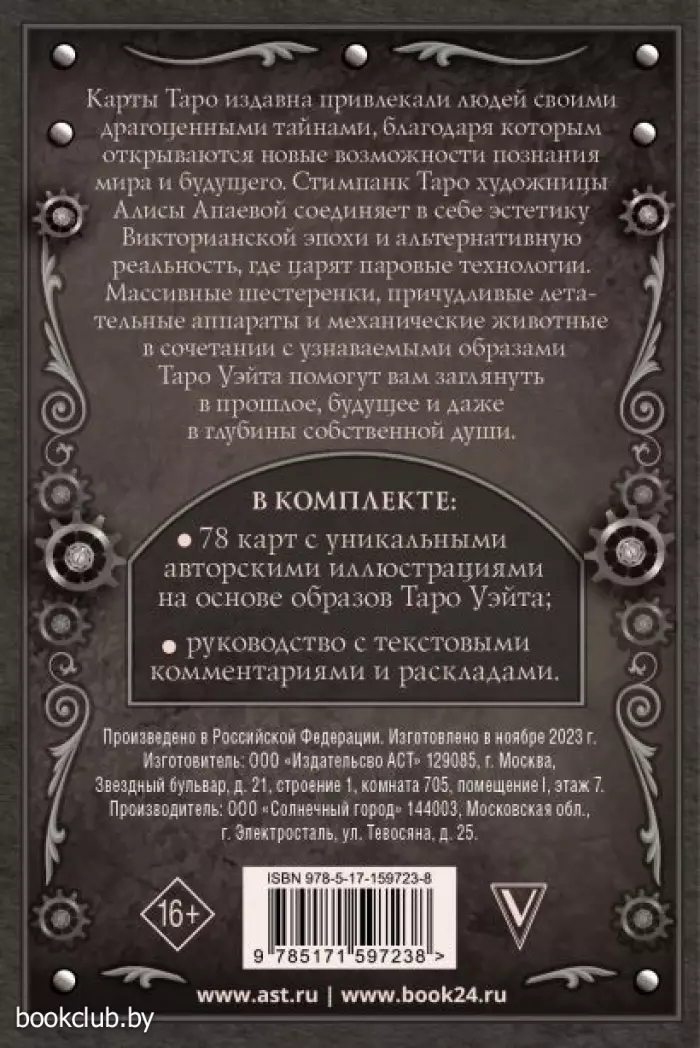 Карты Таро издавна привлекали людей своими драгоценными тайнами, благодаря которым открываются новые возможности познания мира и будущего. Стимпанк Таро художницы Алисы Апаевой соединяет в себе эстетику Викторианской эпохи и альтернативную реальность, где царят паровые технологии. Массивные шестеренки, причудливые летательные аппараты и механические животные в сочетании с узнаваемыми образами Таро Уэйта помогут вам заглянуть в прошлое, будущее и даже в глубины собственной души.