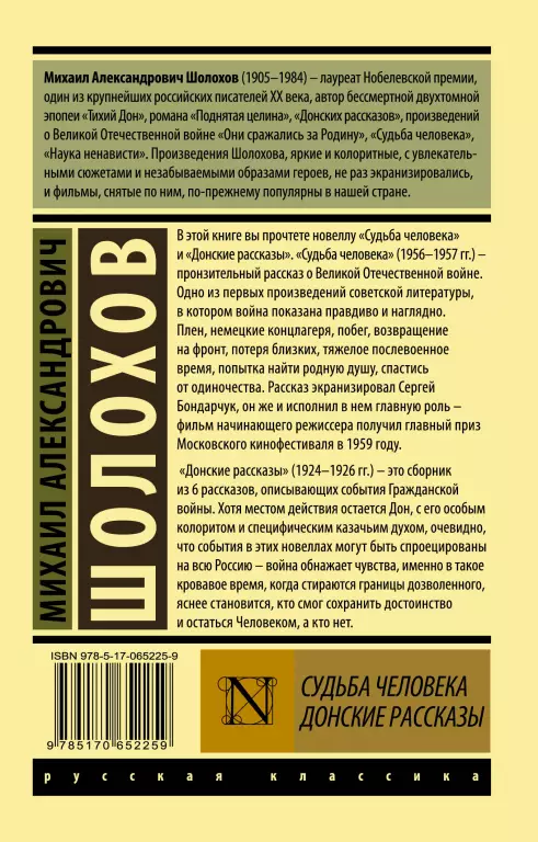 Пронзительное произведение, одно из первых правдиво показавшее события Великой Отечественной войны («Судьба человека»). Сборник из 6 рассказов – о Гражданской войне, остро поставившей вопрос: кто сохранил достоинство и остался Человеком, а кто – нет? («Донские рассказы»).