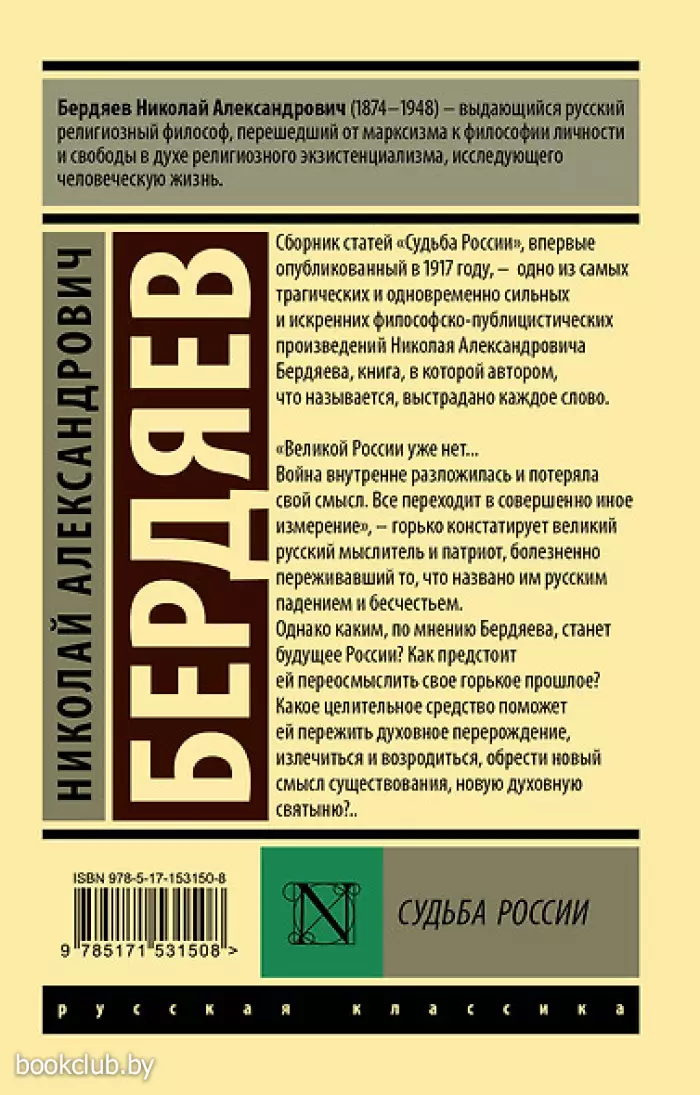 Сборник статей "Судьба России", впервые опубликованный в 1917-м году, - одно из самых трагических и одновременно сильных и искренних философско-публицистических произведений Николая Александровича Бердяева, книга, в которой автором, что называется, выстрадано каждое слово."Великой России уже нет... Война внутренне разложилась и потеряла свой смысл. Все переходит в совершенно иное измерение", - горько констатирует великий русский мыслитель и патриот, болезненно переживавший то, что названо им "русским падением и бесчестьем".Однако какой, по мнению Бердяева, станет будущая судьба России? Как предстоит ей переосмыслить свое горькое прошлое? Какое целительное средство поможет ей пережить духовное перерождение, излечиться и возродиться, обрести новый смысл существования, новую духовную святыню?...
