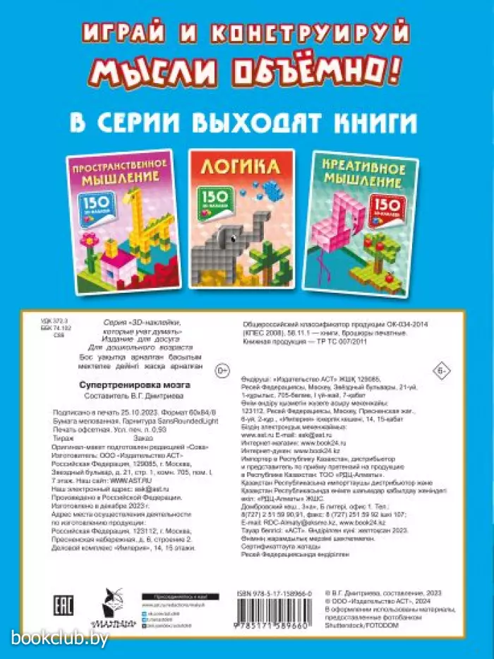 «Супертренировка мозга» — это развивающая книжка с 3D-наклейками для детей от 5 лет. 3D-стикеры — специальные «кирпичики», из которых нужно строить различные трёхмерные объекты. Заниматься по рабочей тетради не только интересно, но и очень полезно, ведь моделирование объёмных предметов стимулирует пространственное мышление, развитие логики, интеллекта, внимания, памяти.