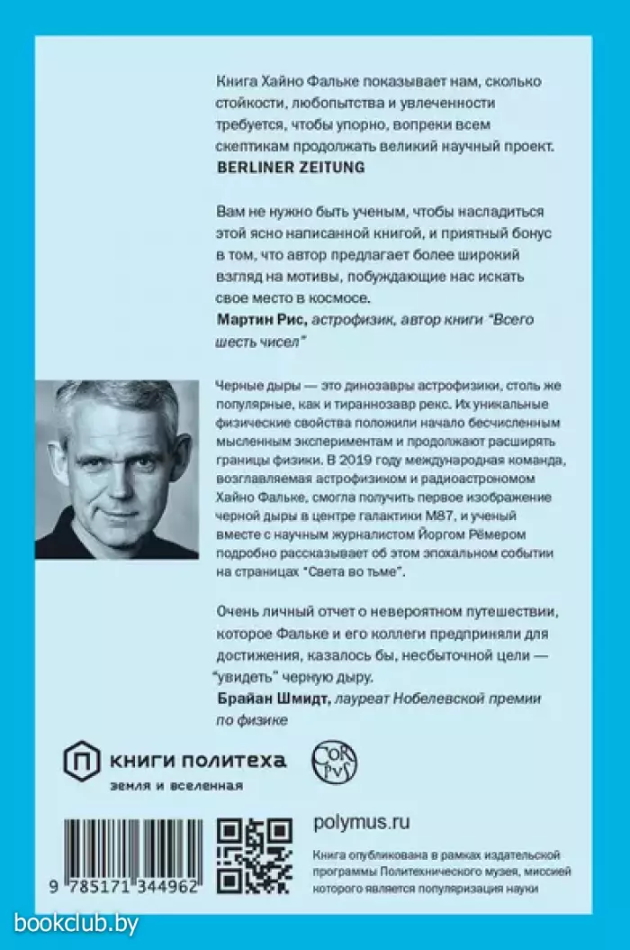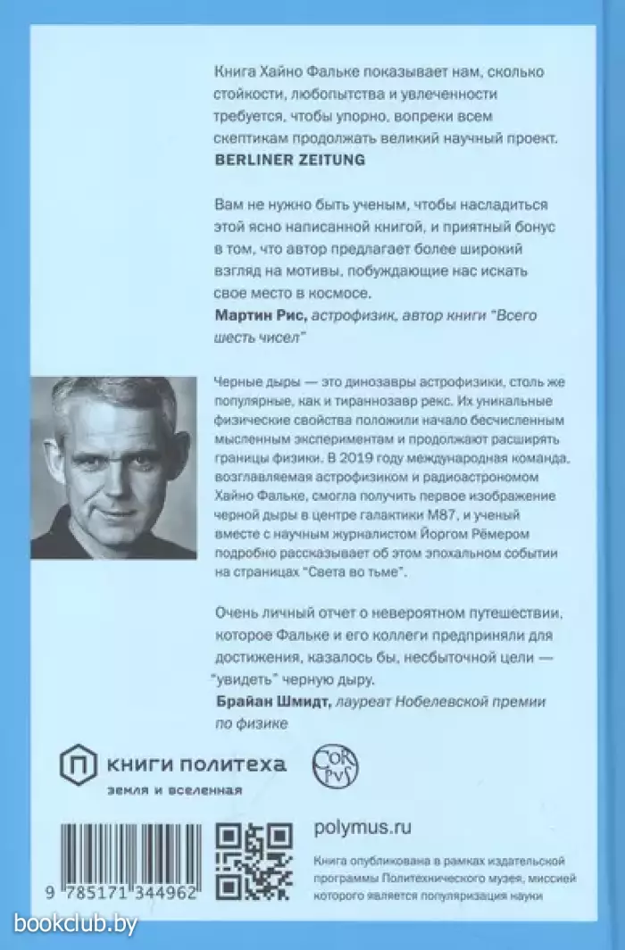 Читатель “Света во тьме” узнает, как группа ученых-энтузиастов сначала убедила распределителей ресурсов (денег, радиотелескопов, мощных компьютеров) выделить на задуманный проект достаточное их количество, а затем провела наблюдения, проанализировала данные и получила долгожданное изображение. “Мифическое существо космических размеров обрело форму и цвет, и каждый человек смог его увидеть”, — подытоживает Фальке. Он занимался этим проектом более двадцати лет, и его, верующего христианина, пастора-мирянина, не пугало, что многие именуют черные дыры “вратами ада”, ведь цель науки — раздвигать границы неизведанного.