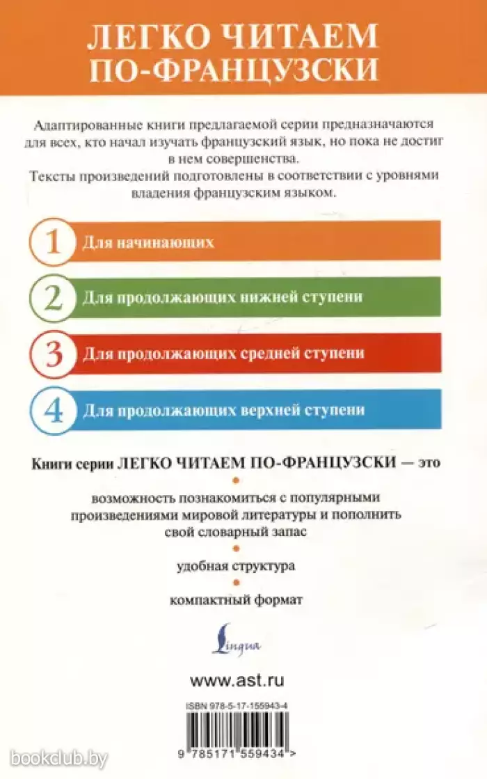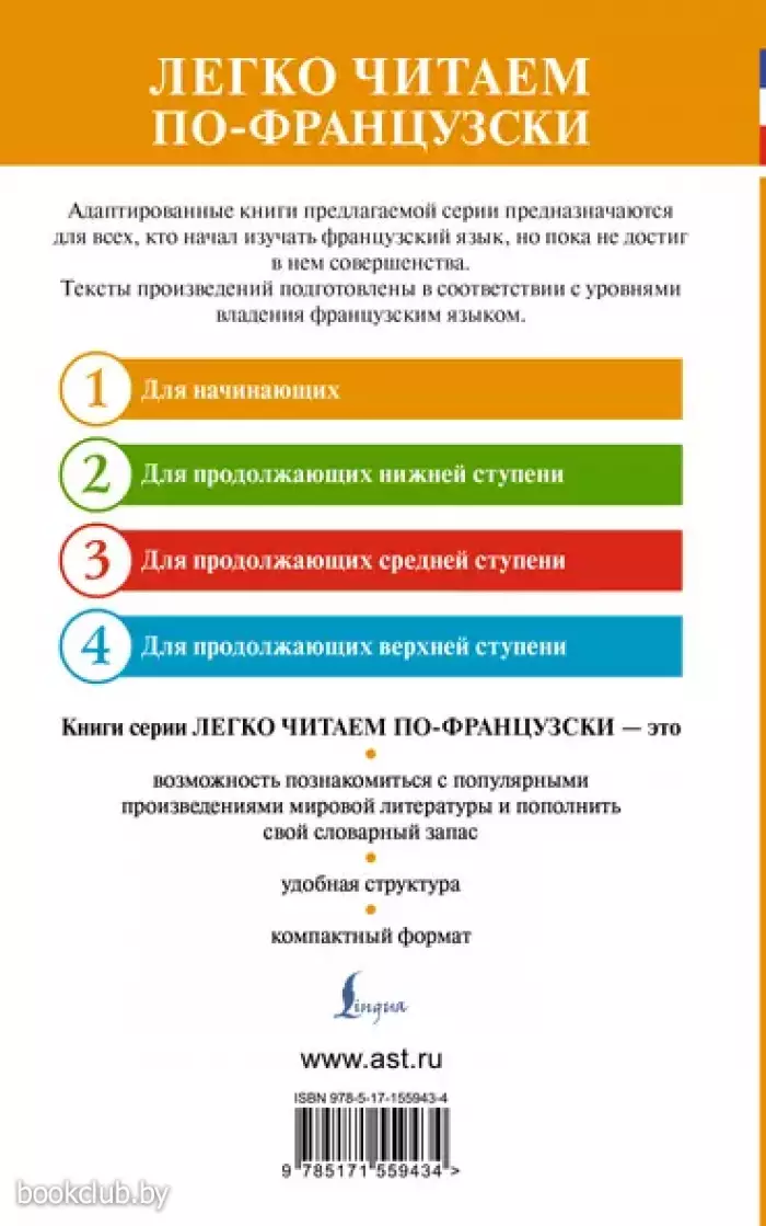 Книги издательства «АСТ» из серии «Легко читаем по-французски» - отличное приобретение для вас и ваших близких. Для вашего удобства при оформлении заказа по телефону назовите код товара: 407240