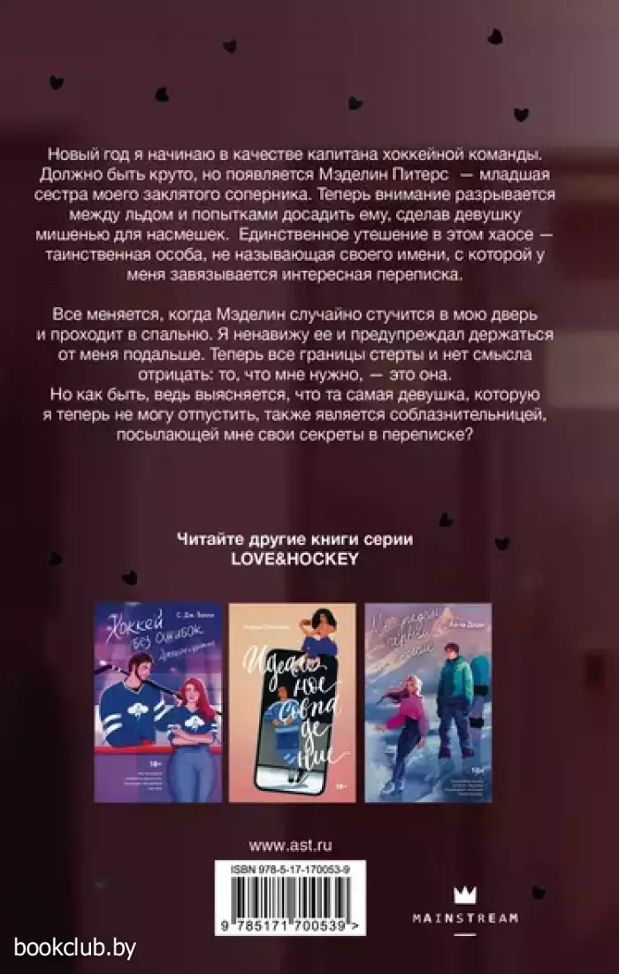 Новый год я начинаю в качестве капитана хоккейной команды. Должно быть круто, но появилась Мэделин Питерс - младшая сестра моего заклятого соперника. Теперь внимание разрывается между льдом и попытками досадить ему, сделав девушку мишенью для насмешек. Единственное утешение в этом хаосе - таинственная особа не называющая своего имени, с которой у меня завязывается интересная переписка. Все меняется, когда Мэделин случайно стучится в мою дверь и проходит в спальню. Я ненавижу ее и предупреждал держаться от меня подальше. Теперь все границы стерты и нет смысла отрицать то, что мне нужно, — это она. Но как быть, ведь выясняется, что та самая девушка, которую я теперь не могу отпустить, также является соблазнительницей, посылающей мне свои секреты в переписке?