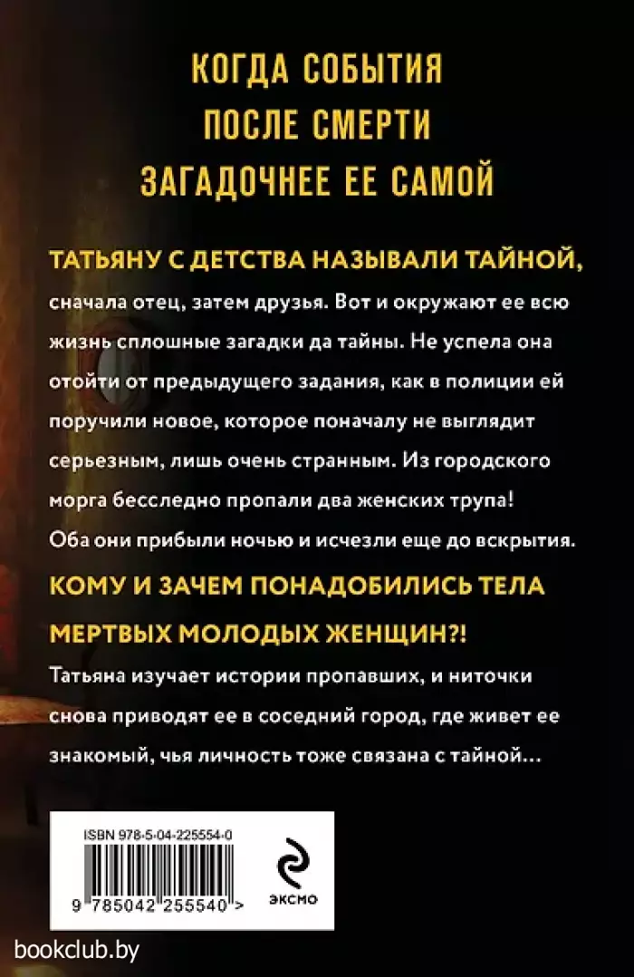 Татьяну с детства называли Тайной, сначала отец, затем друзья. Вот и окружают её всю жизнь сплошные загадки да тайны. Не успела она отойти от предыдущего задания, как в полиции ей поручили новое, которое поначалу не выглядит серьезным, лишь очень странным. Из городского морга бесследно пропали два женских трупа! Оба они прибыли ночью и исчезли ещё до вскрытия. Кому и зачем понадобились тела мертвых молодых женщин?! Татьяна изучает истории пропавших, и ниточки снова приводят ее в соседний город, где живет её знакомый, чья личность тоже связана с тайной…