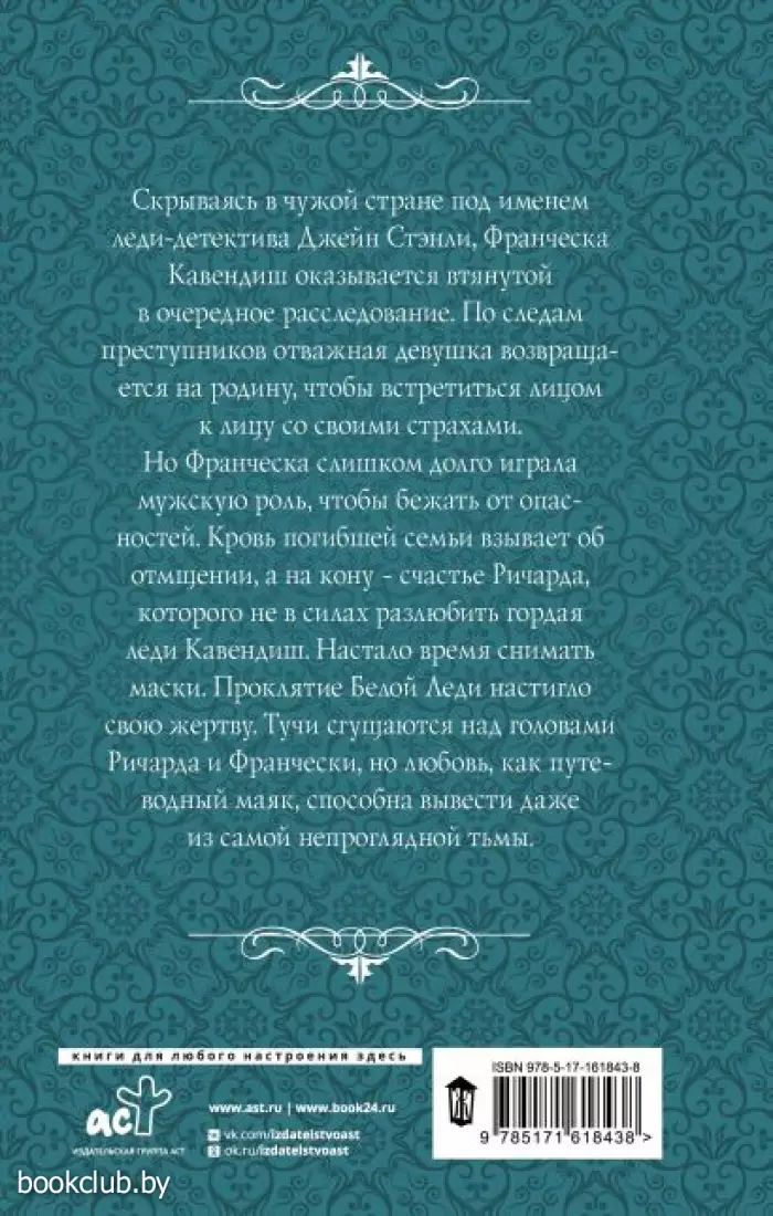 Скрываясь в чужой стране под именем леди-детектива Джейн Стэнли, Франческа Кавендиш оказывается втянутой в очередное расследование. По следам преступников отважная девушка возвращается на родину, чтобы встретиться лицом к лицу со своими страхами. Но Франческа слишком долго играла мужскую роль, чтобы бежать от опасностей. Кровь погибшей семьи взывает об отмщении, а на кону - счастье Ричарда, которого не в силах разлюбить гордая леди Кавендиш. Настало время снимать маски. Проклятие Белой Леди настигло свою жертву. Тучи сгущаются над головами Ричарда и Франчески, но любовь, как путеводный маяк, способна вывести даже из самой непроглядной тьмы.