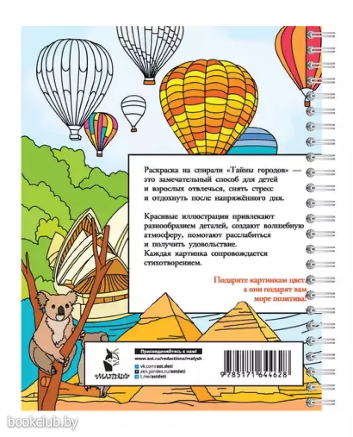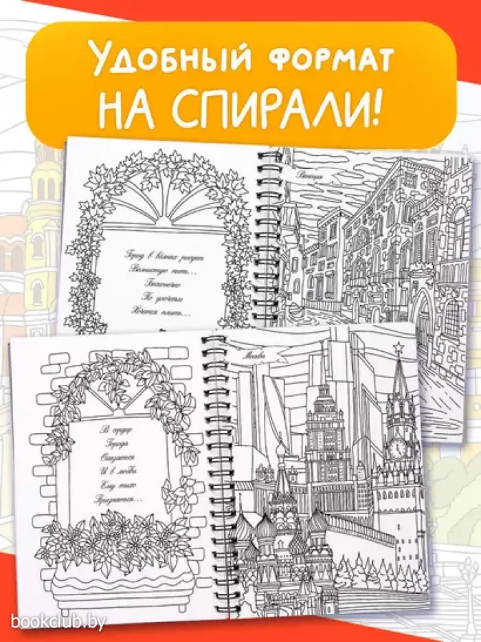 Раскраска на спирали "Тайны городов" — это замечательный способ для детей и взрослых отвлечься, снять стресс и отдохнуть после напряженного дня. Красивые иллюстрации привлекают разнообразием деталей, создают волшебную атмосферу, помогают расслабиться и получить удовольствие. Каждая картинка сопровождается стихотворением.