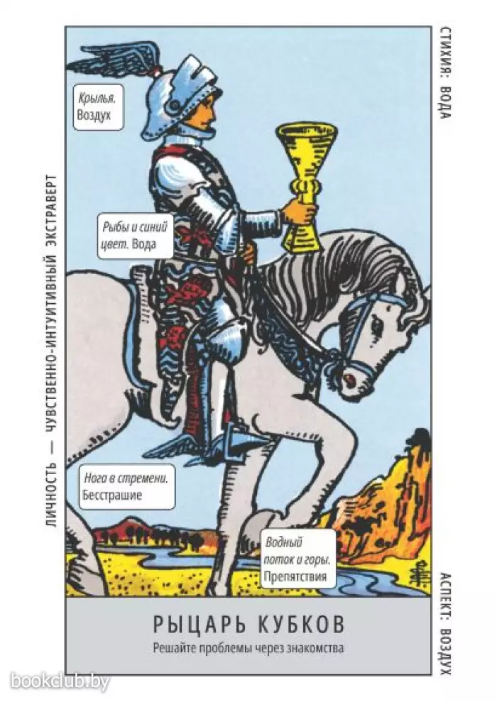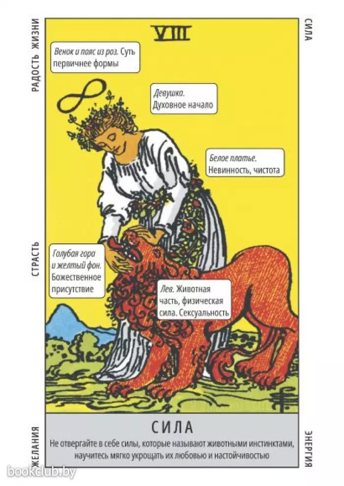 Колоду отличает от других изданий то, что на каждой карте все символы подписаны, надписи сделаны на самих картинках. Это в разы сократит время на запоминание значений карт. А также на погружение в гадания.
