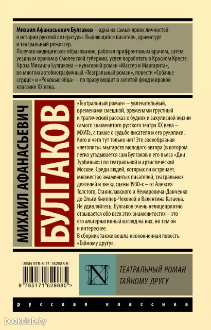 "Театральный роман" – увлекательный, временами смешной, временами грустный и трагический рассказ о буднях и закулисной жизни самого знаменитого русского театра ХХ века – МХАТа, а также о судьбе писателя и его рукописи. Кого и чего тут только нет! Это своеобразная летопись "мытарств" молодого автора (в котором легко угадывается сам Булгаков и его пьеса "Дни Турбиных") по театральной и артистической Москве. Среди людей, которых он встречает, множество знаменитых писателей, театральных деятелей и звезд сцены 1930-х – от Алексея Толстого, Станиславского и Немировича-Данченко до Ольги Книппер-Чеховой и Валентина Катаева. Не удивляйтесь, Булгаков очень нелицеприятно отзывается обо всех этих знаменитостях – это его альтернативный взгляд на них, но тем он и интереснее.