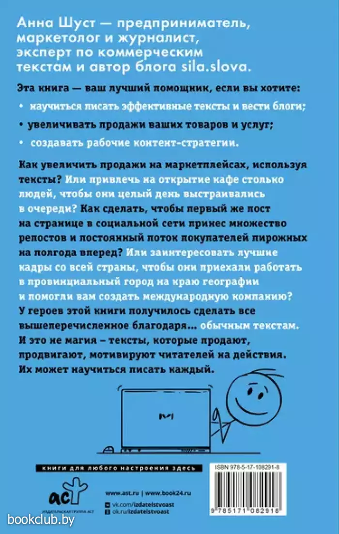 Как увеличить продажи на маркетплейсах, используя тексты? Или привлечь на открытие кафе столько людей, чтобы они целый день выстраивались в очереди? Как сделать, чтобы первый же пост на странице в социальной сети принес множество репостов и постоянный поток покупателей пирожных на полгода вперед? Или заинтересовать лучшие кадры со всей страны, чтобы они приехали работать в провинциальный город на краю географии и помогли вам создать международную компанию? У героев этой книги получилось сделать все вышеперечисленное благодаря… обычным текстам. И это не магия - тексты, которые продают, продвигают, мотивируют читателей на действия. Их может научиться писать каждый.