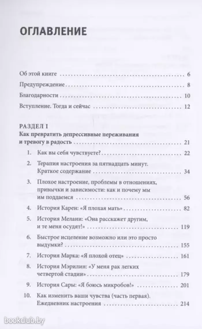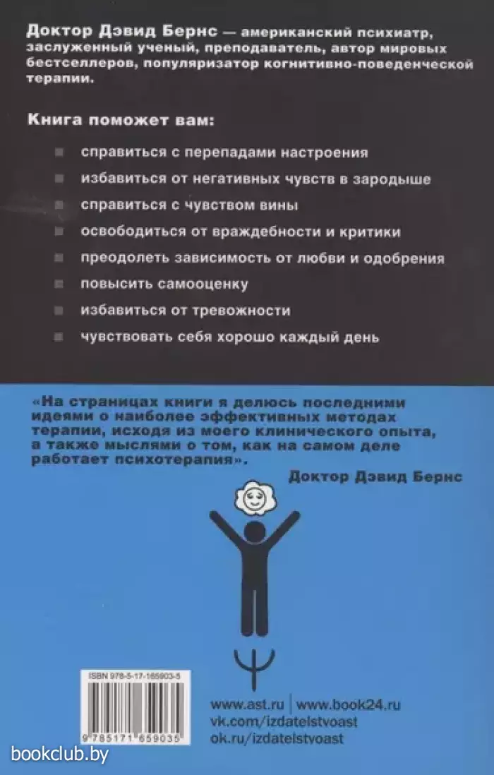 Доктор Дэвид Бернс — американский психиатр, заслуженный ученый, преподаватель, автор мировых бестселлеров, популяризатор когнитивно-поведенческой терапии. Перед вами самое последнее, дополненное издание классической работы Дэвида Бернса, основанное на новейших исследованиях в области психологии. В книге более 50 техник, с помощью которых вы сможете побороть негативные мысли и вызванные ими тревогу и подавленное настроение. Новые методы помогут развить чувство радости и позитивное отношение к себе и к жизни. Книга поможет вам: • справиться с перепадами настроения • избавиться от негативных чувств в зародыше • справиться с чувством вины • освободиться от враждебности и критики • преодолеть зависимость от любви и одобрения • повысить самооценку • избавиться от тревожности • чувствовать себя хорошо каждый день