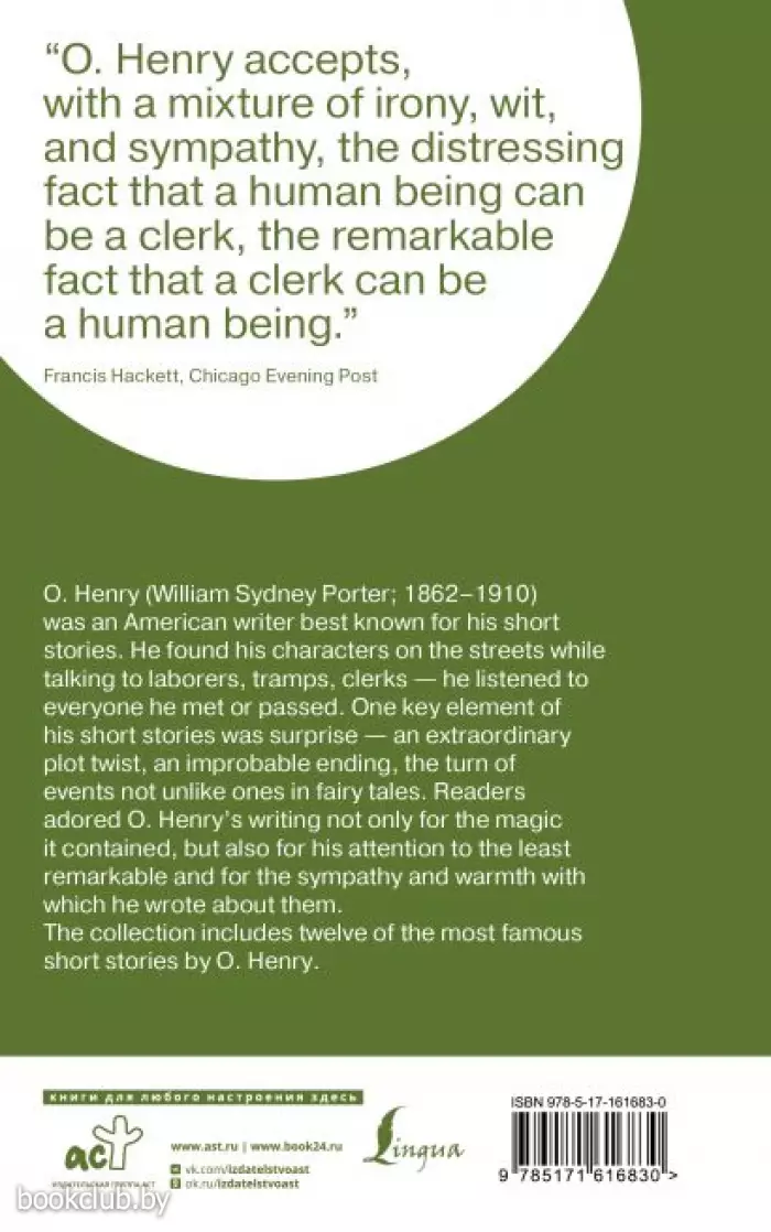 О. Генри (Уильям Сидни Портер) — американский писатель начала двадцатого века. Славу ему принесли рассказы, неизменной деталью которых был элемент неожиданности: невообразимый сюжетный поворот, невероятная развязка, сказочное стечение обстоятельств. О. Генри находил свои истории на улицах и в барах, в разговорах с рабочими, бродягами, клерками — он с готовностью слушал каждого, кто встречался на пути. Рассказы О. Генри полюбились читателям не только заключенной в них магией, но и вниманием автора к самым маленьким людям, а также теплом и сочувствием, с которыми он о них писал.