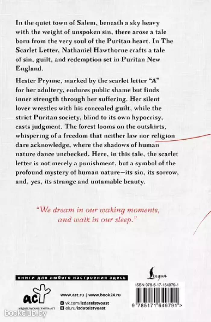 "Алая буква" Натаниэля Готорна — это захватывающий роман, опубликованный в 1850 году, символ американской литературы. В центре сюжета — история Эстер Прин, женщины, которая столкнулась с общественным осуждением и непониманием из-за своей любви. Эстер вынуждена носить алую букву "А" на одежде, ставшую символом её греха и страсти. Роман исследует темы морали, духовности и борьбы за справедливость, показывая, что иногда для обретения свободы и прощения нужно пройти через тяжёлые испытания.