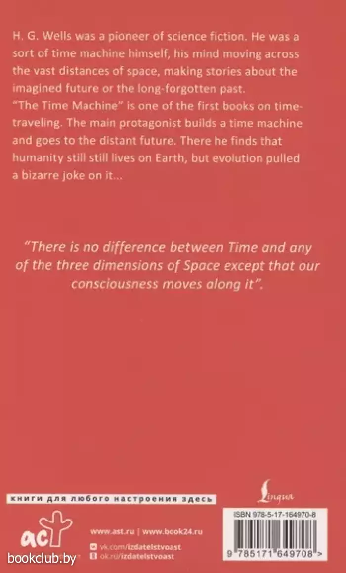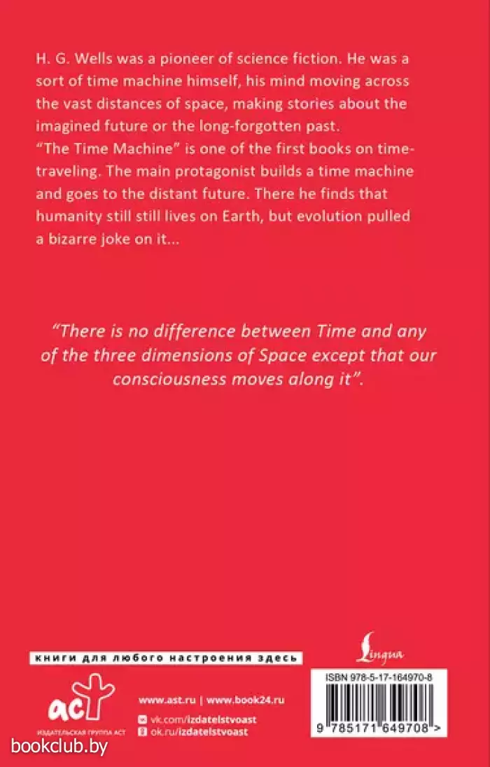 Не хватает времени подтянуть английский? Вам поможет "The Time Machine"! Герберт Дж. Уэллс был пионером научной фантастики. Он одним из первых создал книгу, сюжет которой развивается вокруг машины времени -- механизма, способного перемещать своего владельца между эпозами. Из викторианской Англии главный герой попадает на Землю будущего, всё ещё населенную людьми. Вот только люди эти уже здорово изменились... Книга издана без сокращений и адаптации. Наслаждайтесь новаторским гением Герберта Уэллса в оригинале!