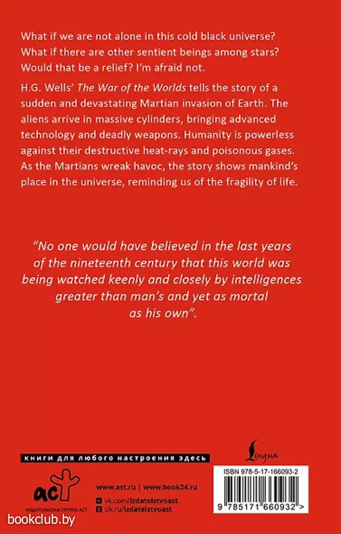 Герберт Уэллс был по-настоящему талантливым писателем, визионером. Его книги во многом предсказали будущее. "Война миров" - один из первых его романов, и один из наиболее известных. Речь в нем идет о столкновении цивилизаций: земной и марсианской, которая оказалась не такой уж дружелюбной. Роман справедливо занял одно из первых мест в пантеоне научной фантастики.