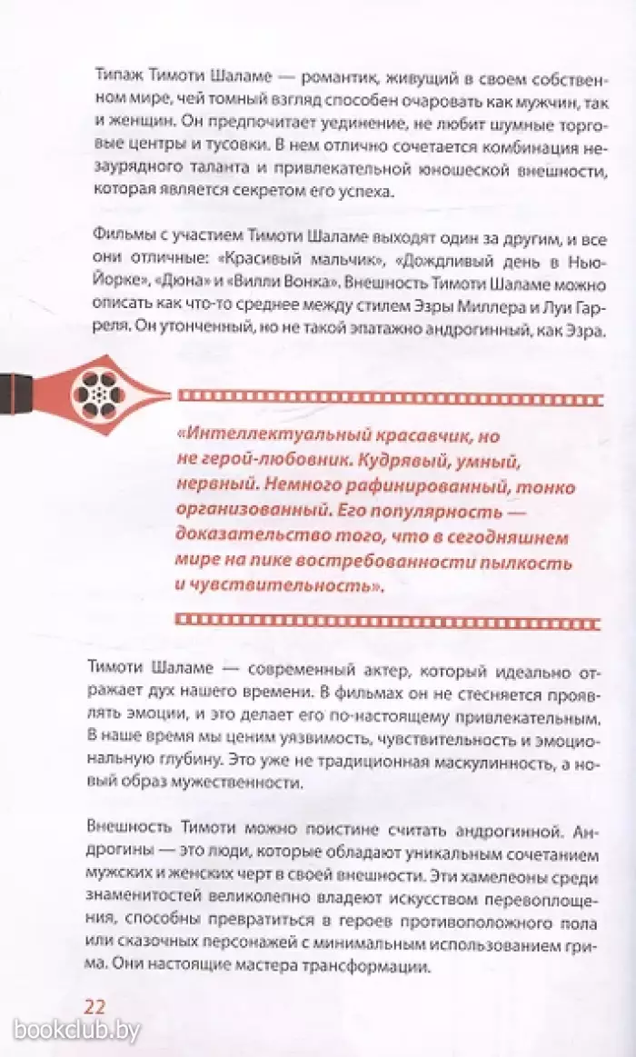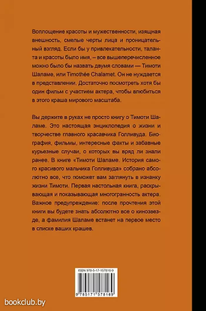 Воплощение красоты и мужественности, изящная внешность, смелые черты лица и проницательный взгляд. Если бы у привлекательности, таланта и красоты было имя – все вышеперечисленное можно было бы назвать двумя словами – Тимоти Шаламе, или Timothée Chalamet. Он не нуждается в представлении. Достаточно посмотреть хотя бы один фильм с участием актера, чтобы влюбиться в этого краша мирового масштаба. Вы держите в руках не просто книгу о Тимоти Шаламе. Это настоящая энциклопедия о жизни и творчестве главного красавчика Голливуда. Биография, фильмы, интересные факты и забавные курьезные случаи, о которых вы вряд ли знали ранее. В книге «Тимоти Шаламе. История самого красивого мальчика Голливуда» собрано абсолютно все, что поможет вам заглянуть в изнанку жизни Тимоти. Первая настольная книга, раскрывающая и показывающая многогранность актера. Важное предупреждение: после прочтения этой книги вы будете знать абсолютно все о кинозвезде, а фамилия Шаламе встанет на первое место в списке ваших крашев.
