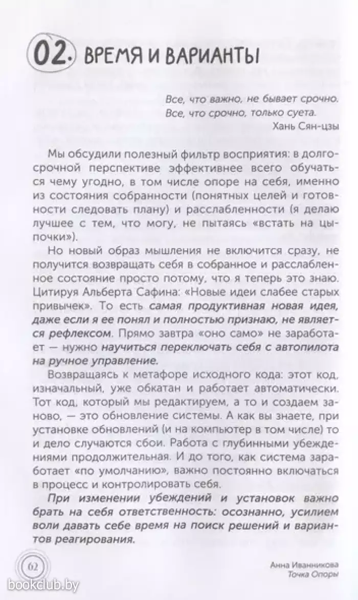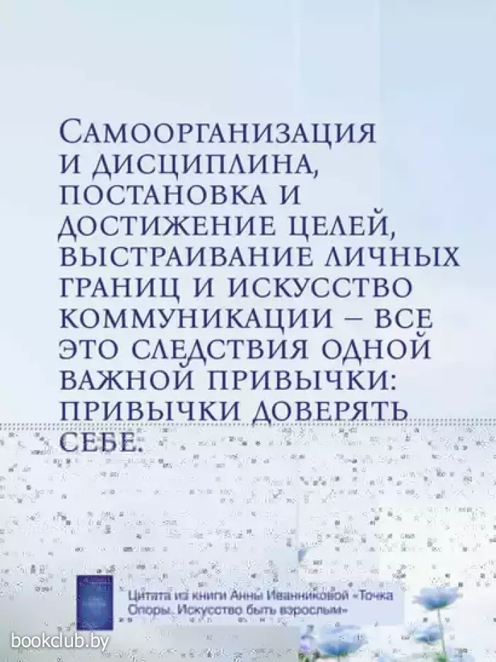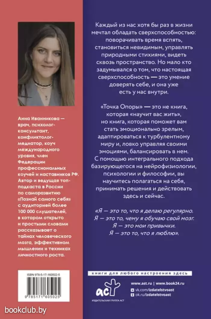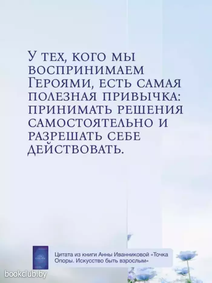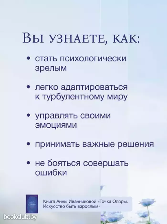 «Точка Опоры» — это не книга, которая «научит вас жить», но книга, которая поможет вам стать эмоционально зрелым, адаптироваться к турбулентному миру и, ловко управляя своими эмоциями, балансировать в нем. С помощью интегрального подхода, базирующегося на нейрофизиологии, психологии и философии, вы научитесь полагаться на себя, принимать решения и действовать здесь и сейчас.
