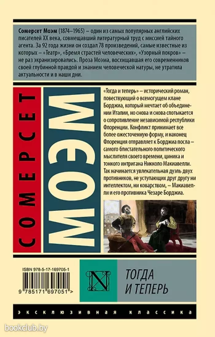 "Тогда и теперь" — исторический роман, повествующий о всемогущем клане Борджиа, который мечтает об объединении Италии, но снова и снова спотыкается о сопротивление независимой республики Флоренции. Конфликт принимает все более ожесточенную форму, и наконец Флоренция отправляет к Борджиа посла — самого блистательного политического мыслителя своего времени, циника и тонкого интригана Никколо Макиавелли. Так начинается увлекательная дуэль двух противников, не уступающих друг другу ни ителлектом, ни коварством, — Макиавелли и его противника Чезаре Борджиа.