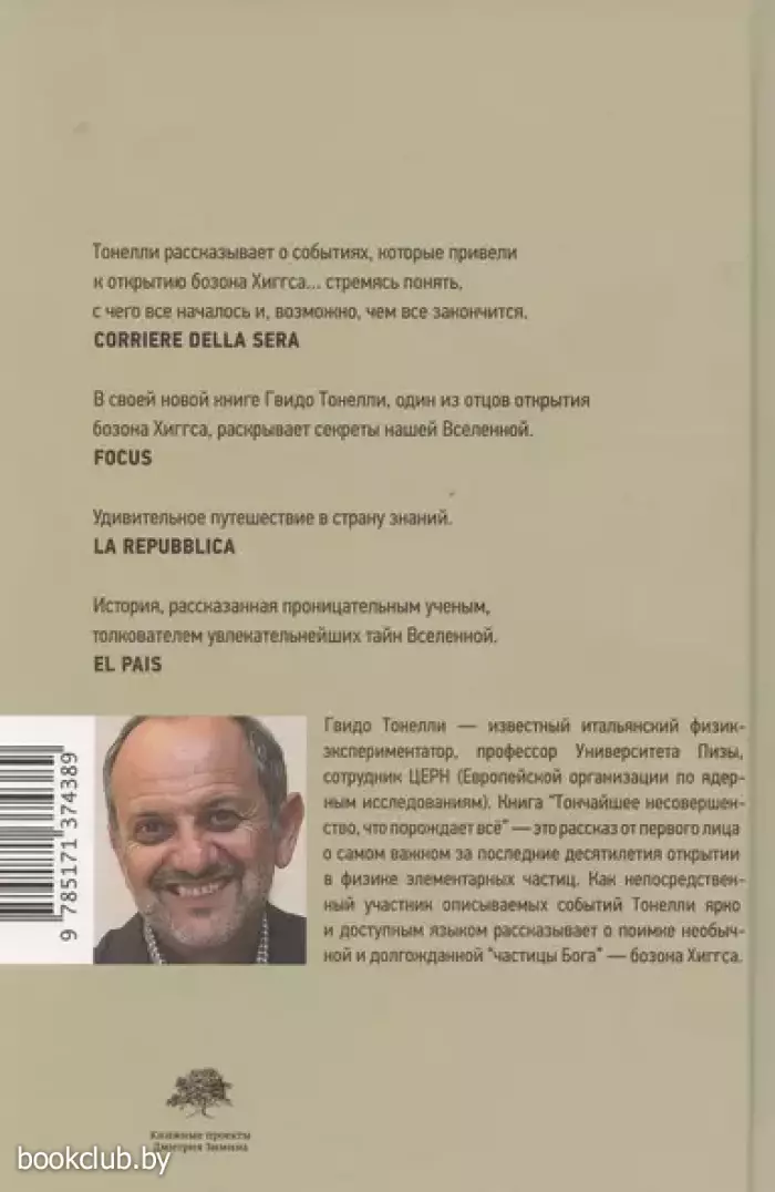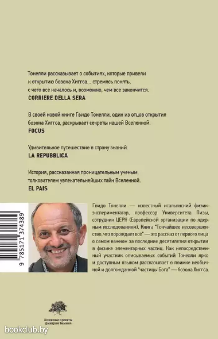 Гвидо Тонелли — один из авторитетнейших современных физиков-экспериментаторов, профессор Университета Пизы, сотрудник Европейской организации по ядерным исследованиям, автор множества статей и нескольких научно-популярных книг. В “Тончайшем несовершенстве, что порождает всё” он рассказывает об открытии одной из самых загадочных элементарных частиц — бозона Хиггса. Тонелли был непосредственным участником описываемых событий, он работал на Большом адронном коллайдере, являлся официальным представителем эксперимента по поиску бозона Хиггса, и потому его рассказ о том, как совершалось самое важное за последние десятилетия открытие в физике элементарных частиц, получился очень живым и личным.