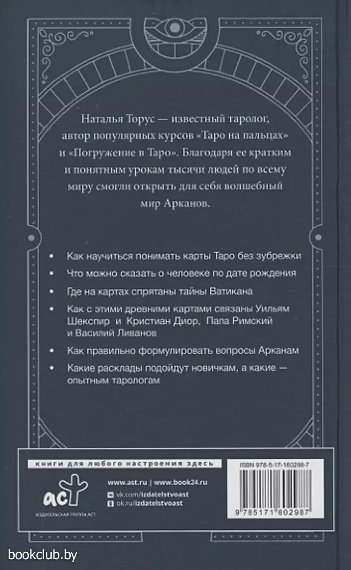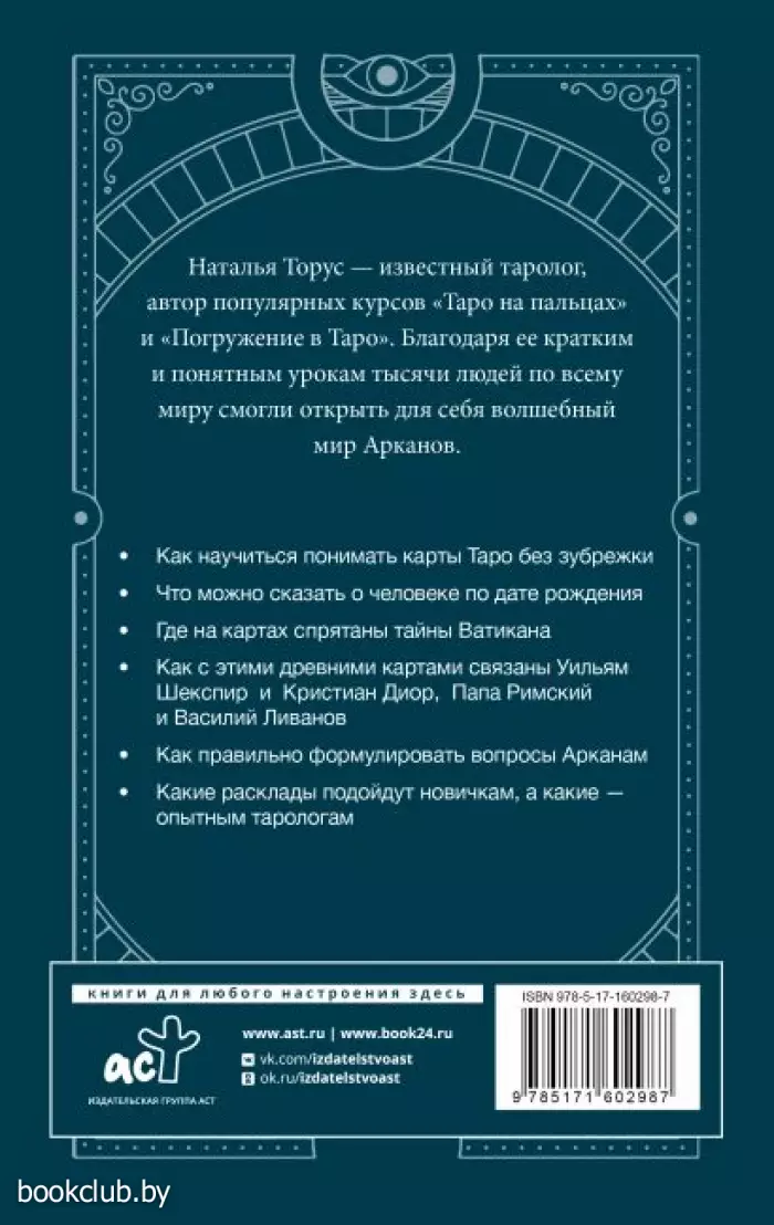 Наталья Торус — известный таролог, автор популярных курсов "Таро на пальцах" и "Погружение в Таро". Благодаря ее кратким и понятным урокам тысячи людей по всему миру смогли открыть для себя волшебный мир Арканов. В книге нет скучной теории или громоздких толкований!