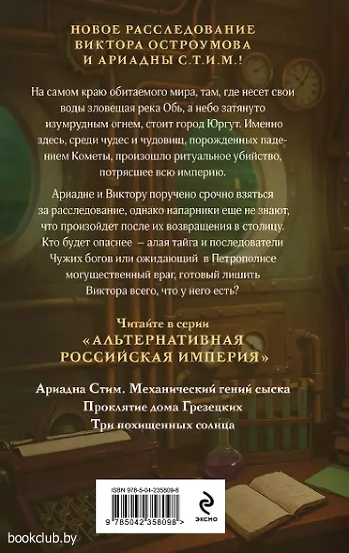 Мир пара, хрустальных дворцов, черного снега и дирижаблей над окутанным дымом Петрополисом: новое детективное расследование в альтернативной Российской империи! На самом краю обитаемого мира, там где несет свои воды зловещая река Обь, а небо затянуто изумрудным огнем, стоит город Юргут. Именно здесь, среди чудес и чудовищ, порожденных падением Кометы, произошло ритуальное убийство, потрясшее всю империю. Ариадне и Виктору поручено срочно взяться за расследование, однако напарники еще не знают, что произойдет после их возвращения в столицу. Кто будет опаснее — алая тайга и последователи Чужих богов или ожидающий в Петрополисе могущественный враг, готовый лишить Виктора всего, что у него есть? Книга от издательства «ЭКСМО», входящая в серию «Альтернативная Российская империя. Расследования механического сыщика», принесет массу положительных впечатлений от прочтения и займет достойное место в вашей библиотеке. Для вашего удобства при оформлении заказа по телефону назовите код товара: 417045