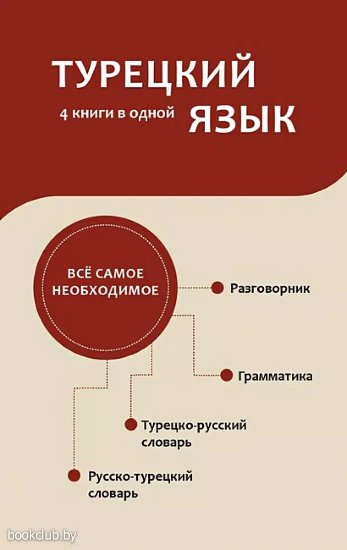 "Турецкий язык. 4 книги в одной: разговорник, турецко-русский словарь, русско-турецкий словарь, грамматика" подойдет для начинающих изучать язык, а также для уровня владения языком А1, А2.