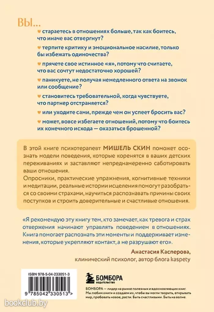 Эта книга поможет справиться: - с тревогой в отношениях; - с неуверенностью в себе; - с проблемами с самооценкой.Вы стараетесь в отношениях больше, так как боитесь, что иначе вас отвергнут?Терпите критику и эмоциональное насилие, только бы избежать одиночества?Прячете свое истинное «я», потому что считаете, что вас сочтут недостаточно хорошей?Паникуете, не получая немедленного ответа на звонок или сообщение?Становитесь требовательной, когда чувствуете, что партнер отстраняется?Или уходите сами, прежде чем он успеет бросить вас?Может, вовсе избегаете отношений, потому что боитесь их конечного исхода — оказаться брошенной? В этой книге психотерапевт Мишель Скин поможет осознать модели поведения, которые коренятся в ваших детских переживаниях и заставляют непреднамеренно саботировать ваши отношения. Опросники, практические упражнения, когнитивные техники и медитации, реальные истории исцеления помогут разобраться со своими страхами, научиться распознавать причины своих поступков и строить доверительные и счастливые отношения. Книги издательства «ЭКСМО» из серии «Облики любви. Посмотри на отношения другими глазами» - отличное приобретение для вас и ваших близких. Для вашего удобства при оформлении заказа по телефону назовите код товара: 417010