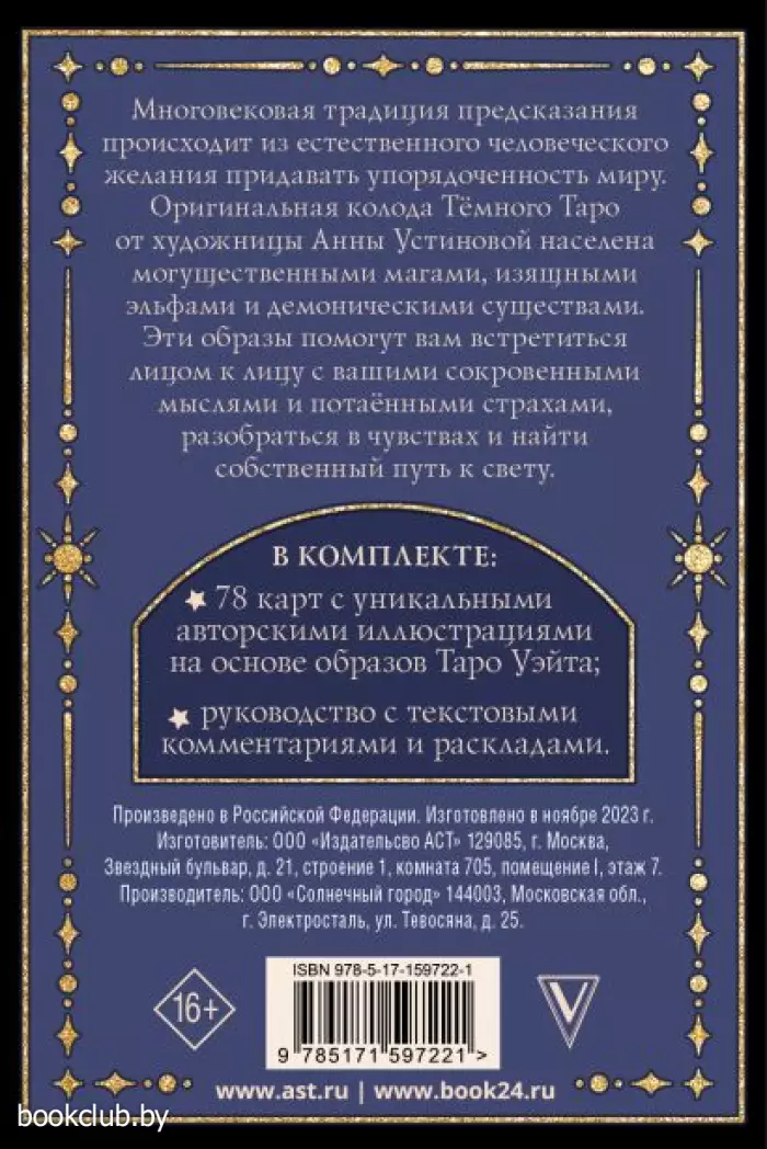 Многовековая традиция предсказания происходит из естественного человеческого желания придавать упорядоченность миру. Оригинальная колода Тёмного Таро от художницы Анны Устиновой населена могущественными магами, изящными эльфами и демоническими существами. Эти образы помогут вам встретиться лицом к лицу с вашими сокровенными мыслями и потаёнными страхами, разобраться в чувствах и найти собственный путь к свету.