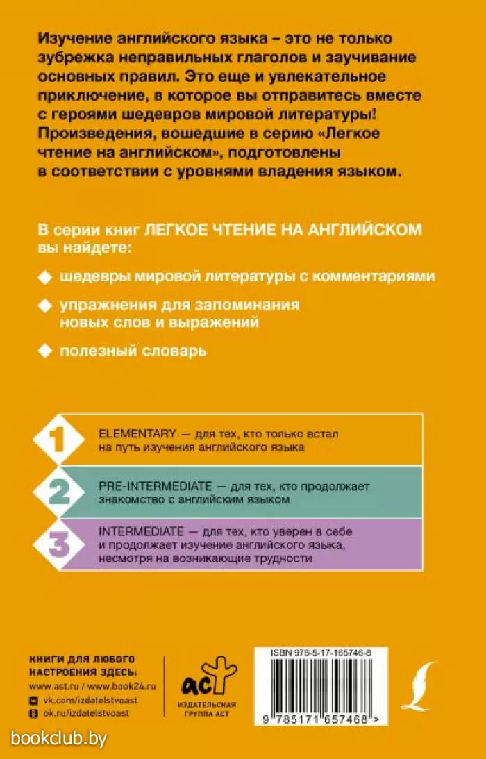 Книга от издательства «АСТ», входящая в серию «Легкое чтение на английском», принесет массу положительных впечатлений от прочтения и займет достойное место в вашей библиотеке. Для вашего удобства при оформлении заказа по телефону назовите код товара: 404681