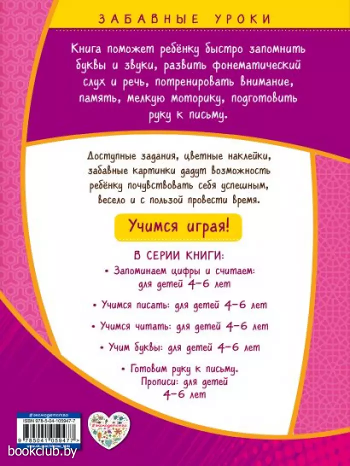 Выполняя увлекательные развивающие задания, ребенок быстро выучит буквы и звуки, разовьёт фонематический слух и речь, потренирует основные когнитивные функции: память, мелкую моторику, внимание, подготовит руку к письму. Все развивающие задания представлены в игровой в форме. Добрые, милые картинки привлекут внимание малыша и найдут эмоциональный отклик. Простота и доступность предлагаемых упражнений даст возможность ребенку почувствовать себя умным и знающим, а красочные наклейки повысят интерес к обучению.