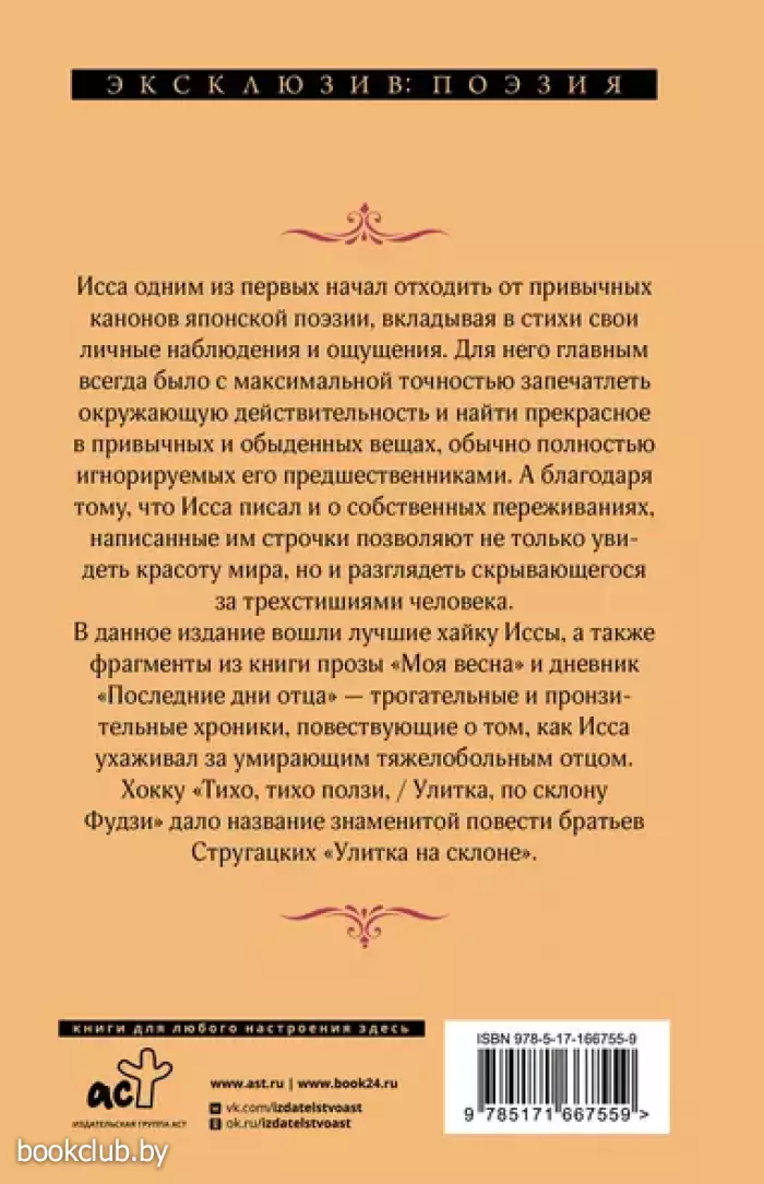 Исса одним из первых начал отходить от привычных канонов японской поэзии, вкладывая в стихи свои личные наблюдения и ощущения. Для него главным всегда было с максимальной точностью запечатлеть окружающую действительность и найти прекрасное в привычных и обыденных вещах, обычно полностью игнорируемых его предшественниками. А благодаря тому, что Исса писал и о собственных переживаниях, написанные им строчки позволяют не только увидеть красоту мира, но и разглядеть скрывающегося за трехстишиями человека. В данное издание вошли лучшие хайку Иссы, а также фрагменты из книги прозы «Моя весна» и дневник «Последние дни отца» — трогательные и пронзительные хроники, повествующие о том, как Исса ухаживал за умирающим тяжелобольным отцом. Хокку «Тихо, тихо ползи, / Улитка, по склону Фудзи» дало название знаменитой повести братьев Стругацких «Улитка на склоне».
