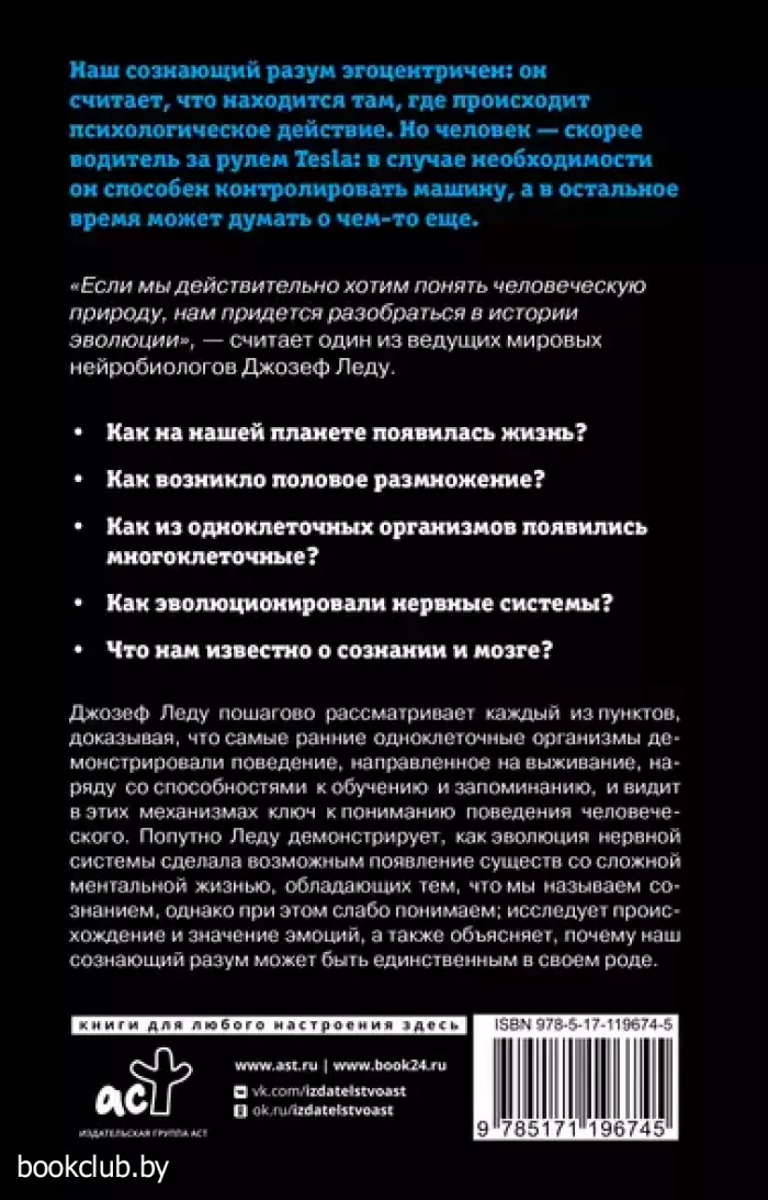 Как на нашей планете появилась жизнь? Как возникло половое размножение? Как из одноклеточных организмов появились многоклеточные? Как эволюционировали нервные системы? Что нам известно о сознании и мозге? Джозеф Леду пошагово рассматривает каждый из пунктов, доказывая, что самые ранние одноклеточные организмы демонстрировали поведение, направленное на выживание, наряду со способностями к обучению и запоминанию, и видит в этих механизмах ключ к пониманию поведения человеческого. Попутно Леду демонстрирует, как эволюция нервной системы сделала возможным появление существ со сложной ментальной жизнью, обладающих тем, что мы называем сознанием, однако при этом слабо понимаем; исследует происхождение и значение эмоций, а также объясняет, почему наш сознающий разум может быть единственным в своем роде.