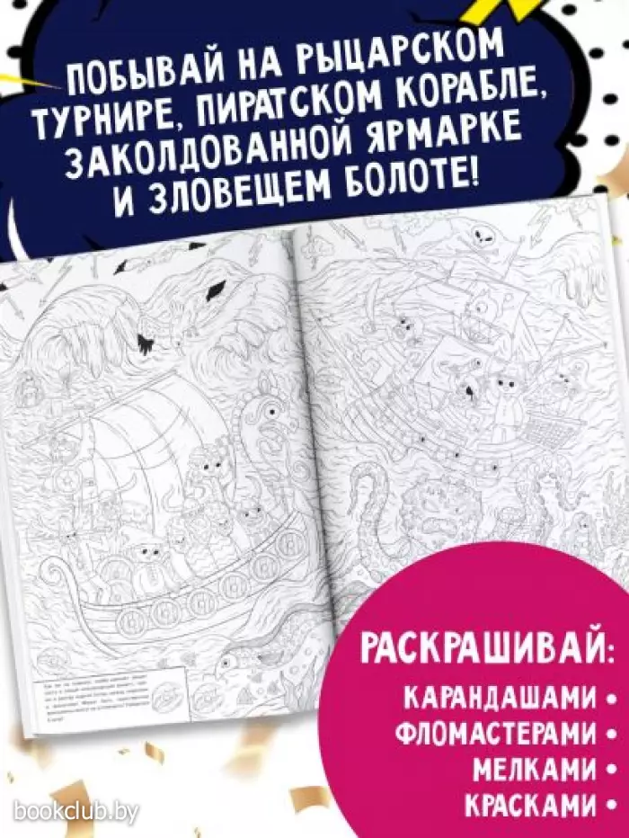 Это не просто виммельбух-раскраска, это – целое весёлое и увлекательное приключение для детей и взрослых. Вместе с искателями приключений познакомьтесь с монстрами и героями фольклора со всего света. Заброшенная шахта, морские просторы, заснеженные горы и густые леса – кто же прячется там в темноте?